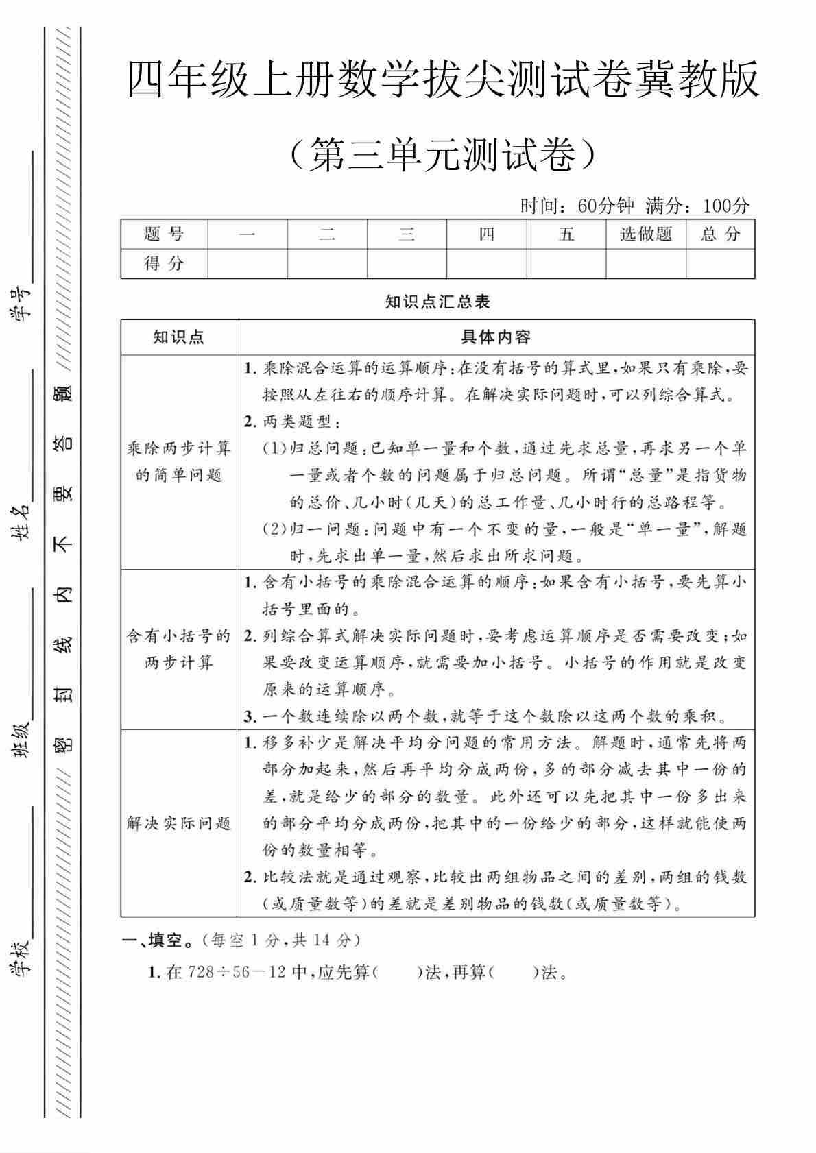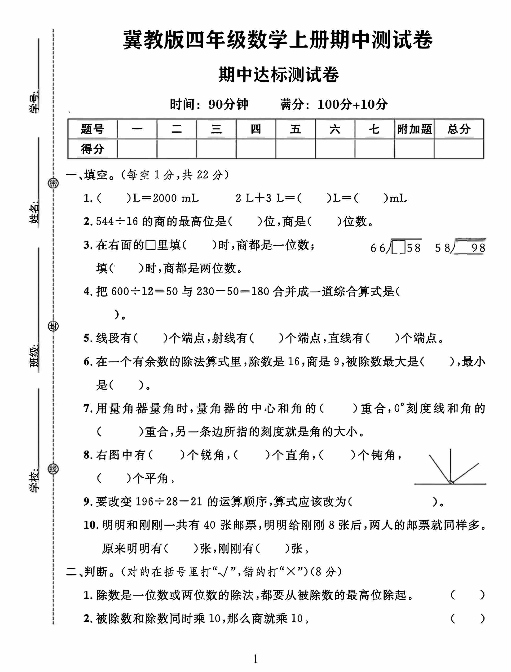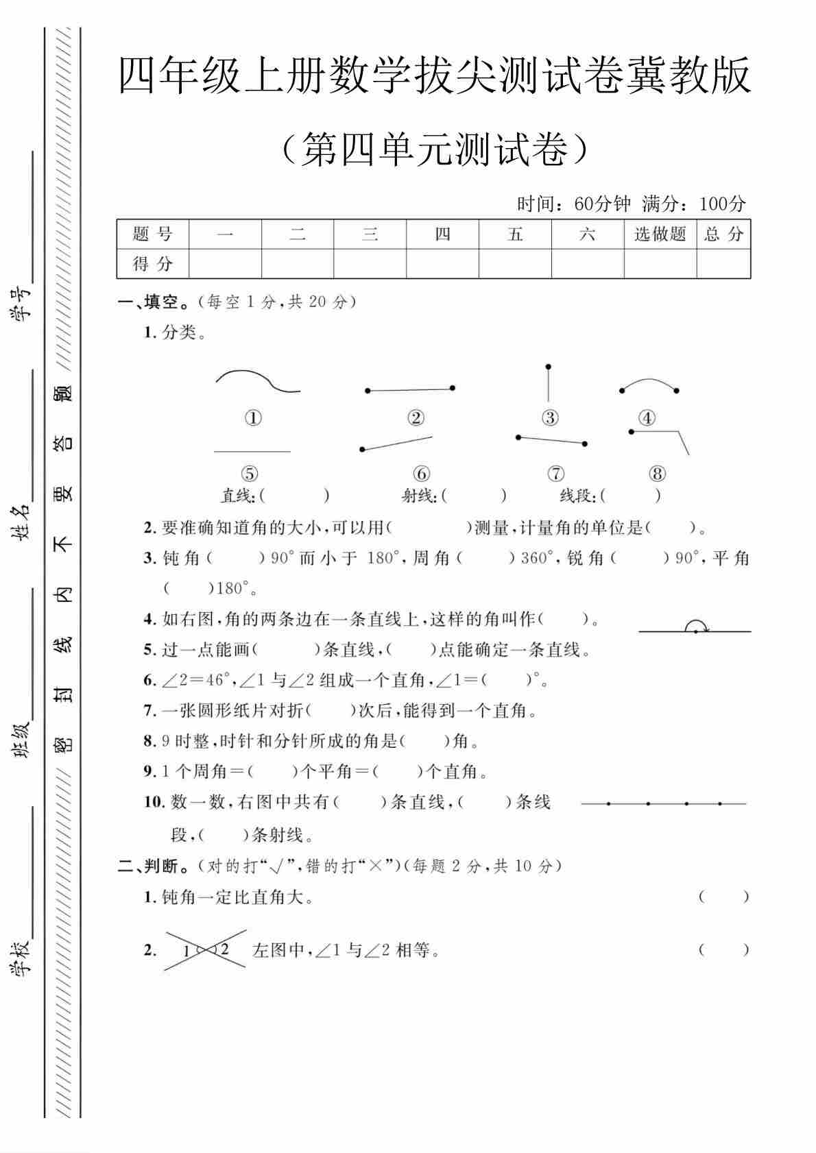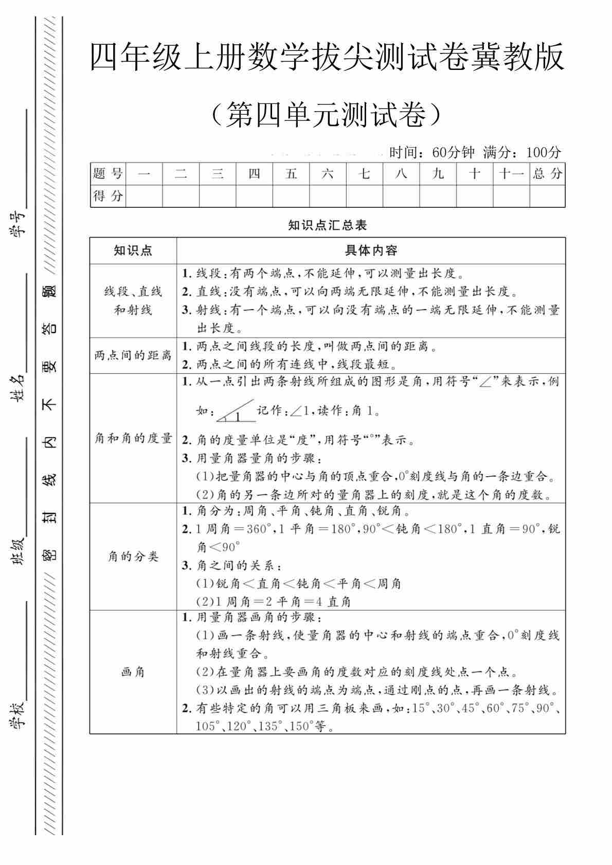 四上冀教版数学【试卷《冲刺100分》】