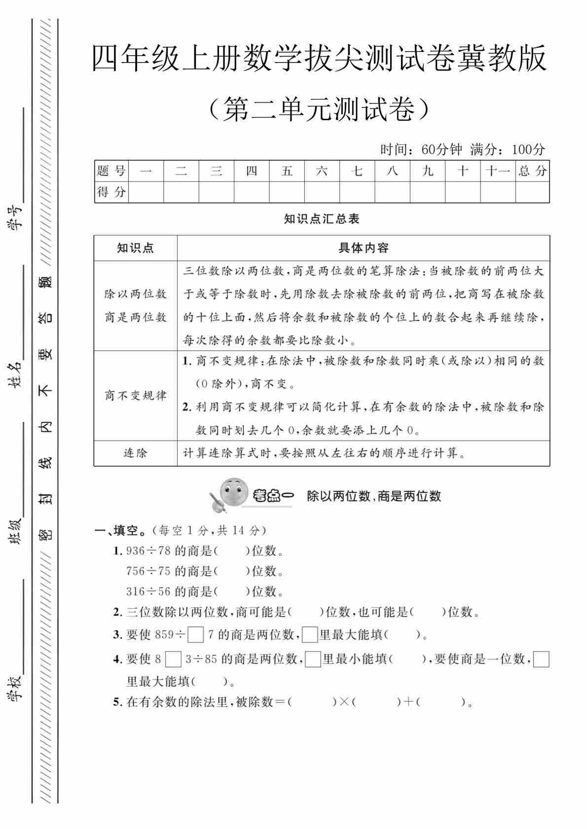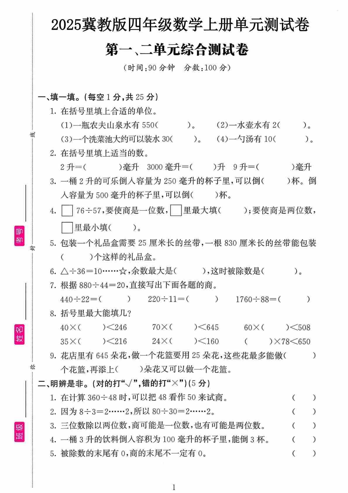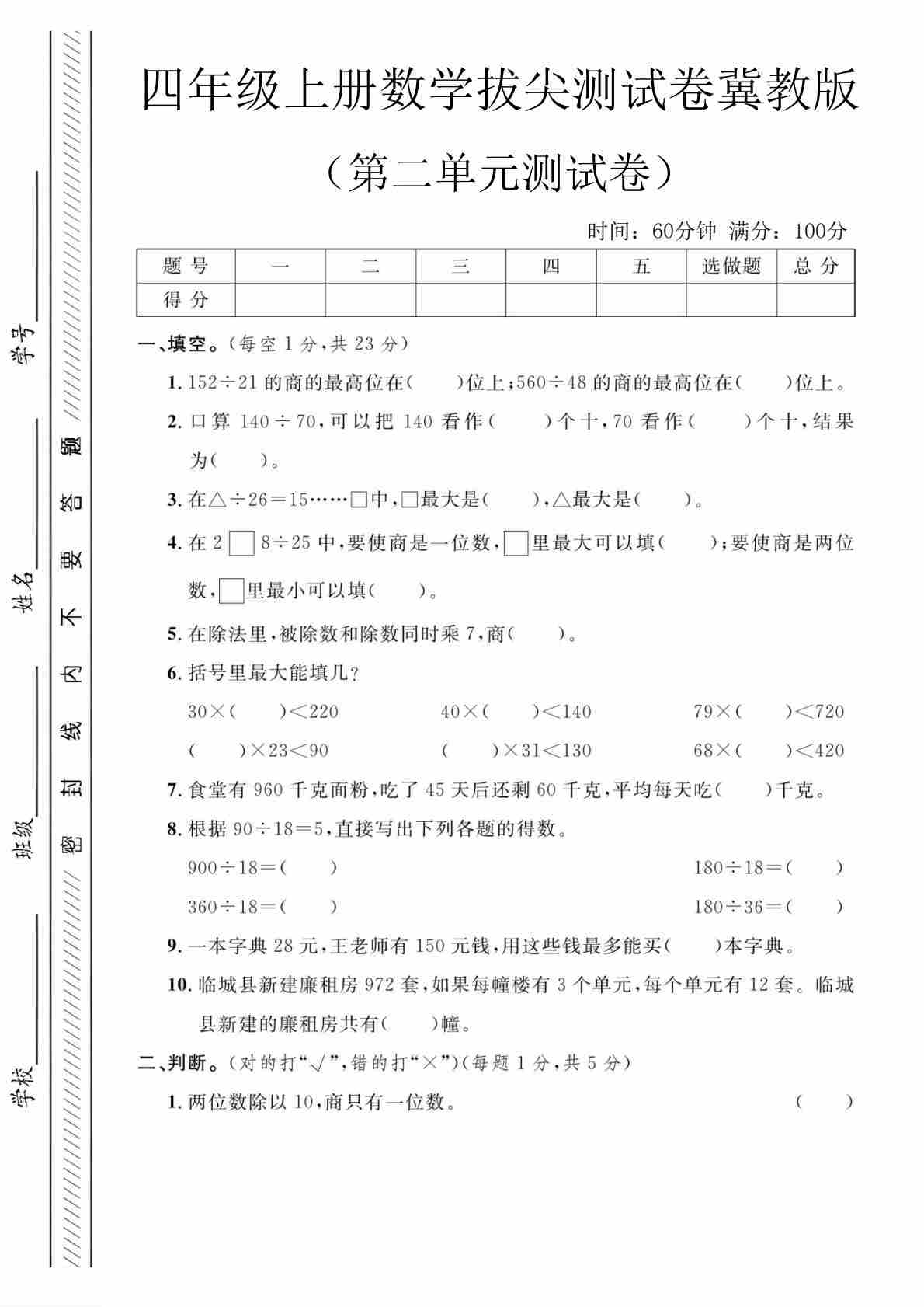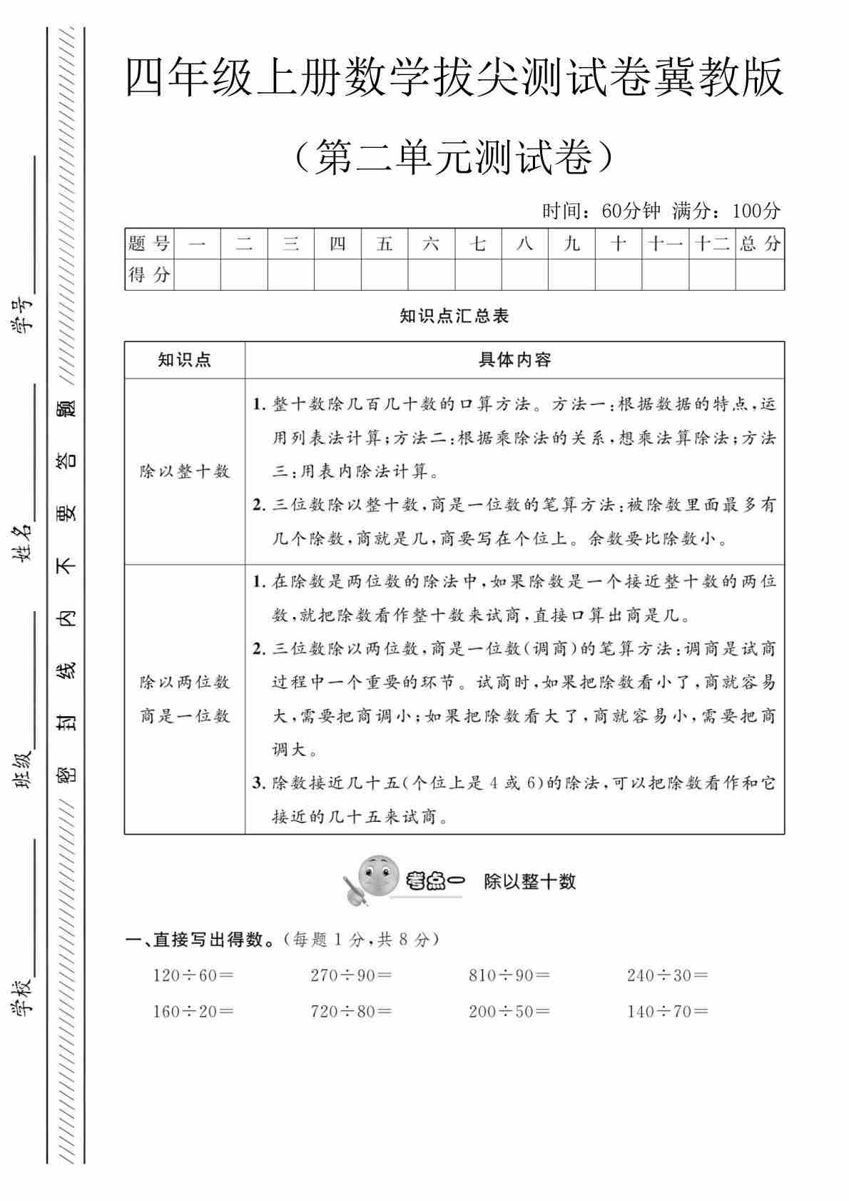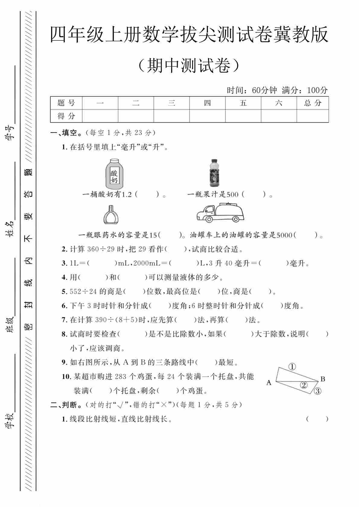 四上冀教版数学【试卷《冲刺100分》】
