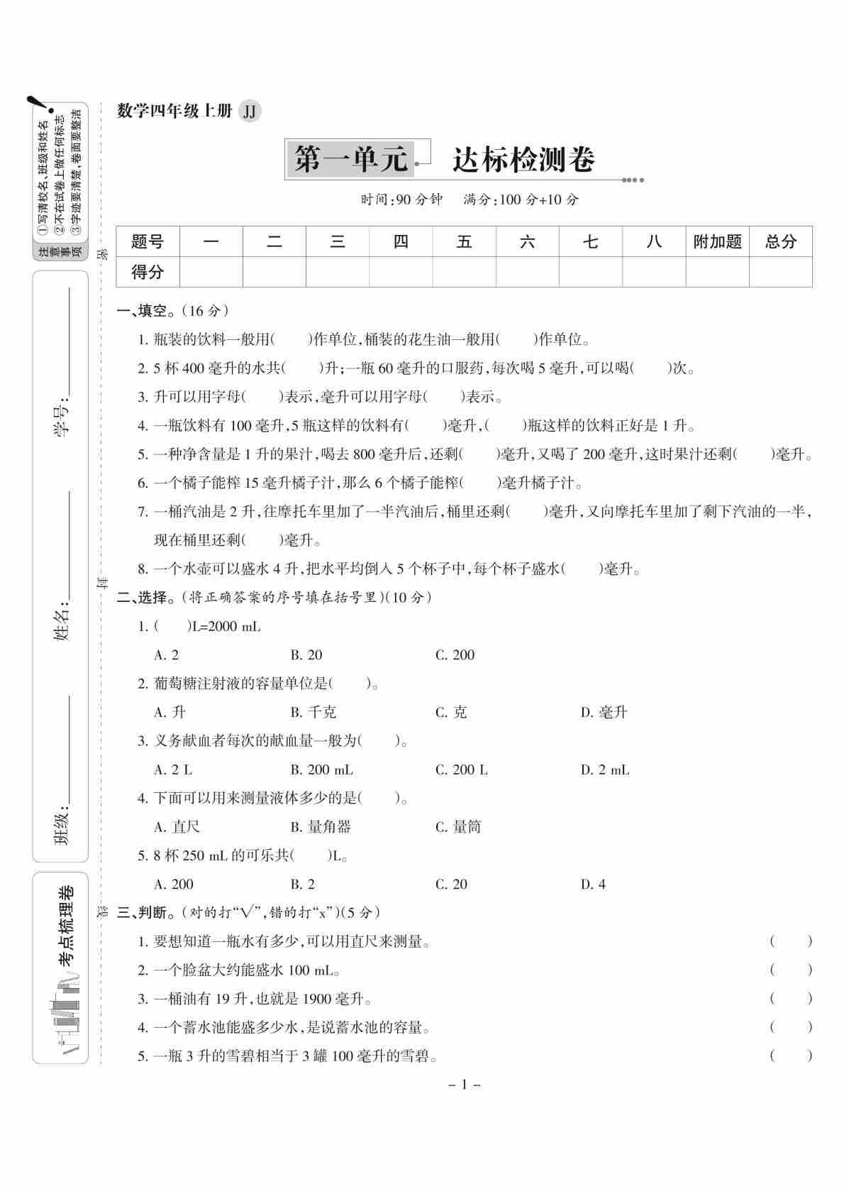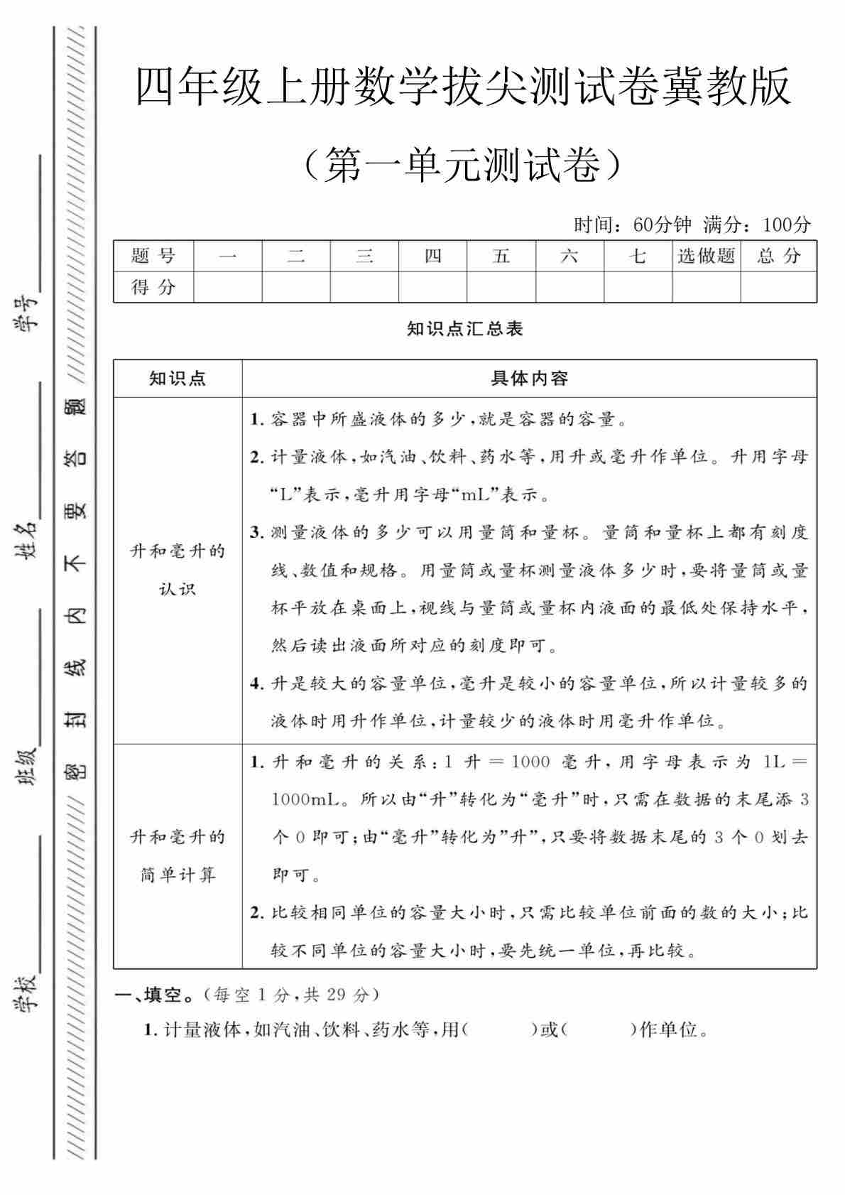 四上冀教版数学:试卷《同步双测卷》1