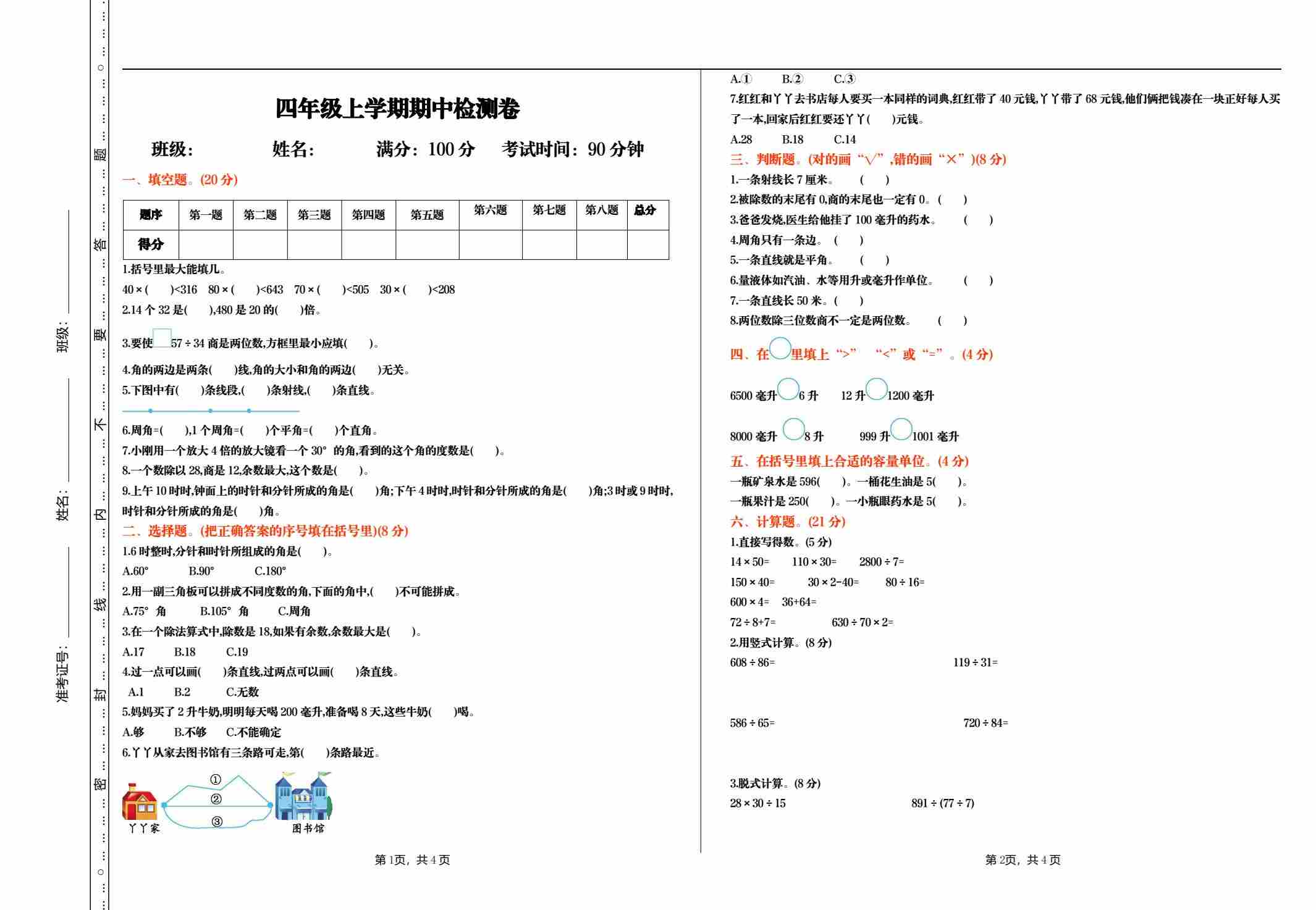 四年级(上)数学 期中测试卷《冀教版》