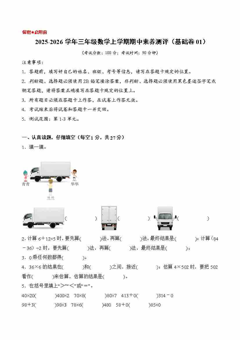 2025-2026年三年级上册数学西师版期中(基础卷01)(考试版A4)