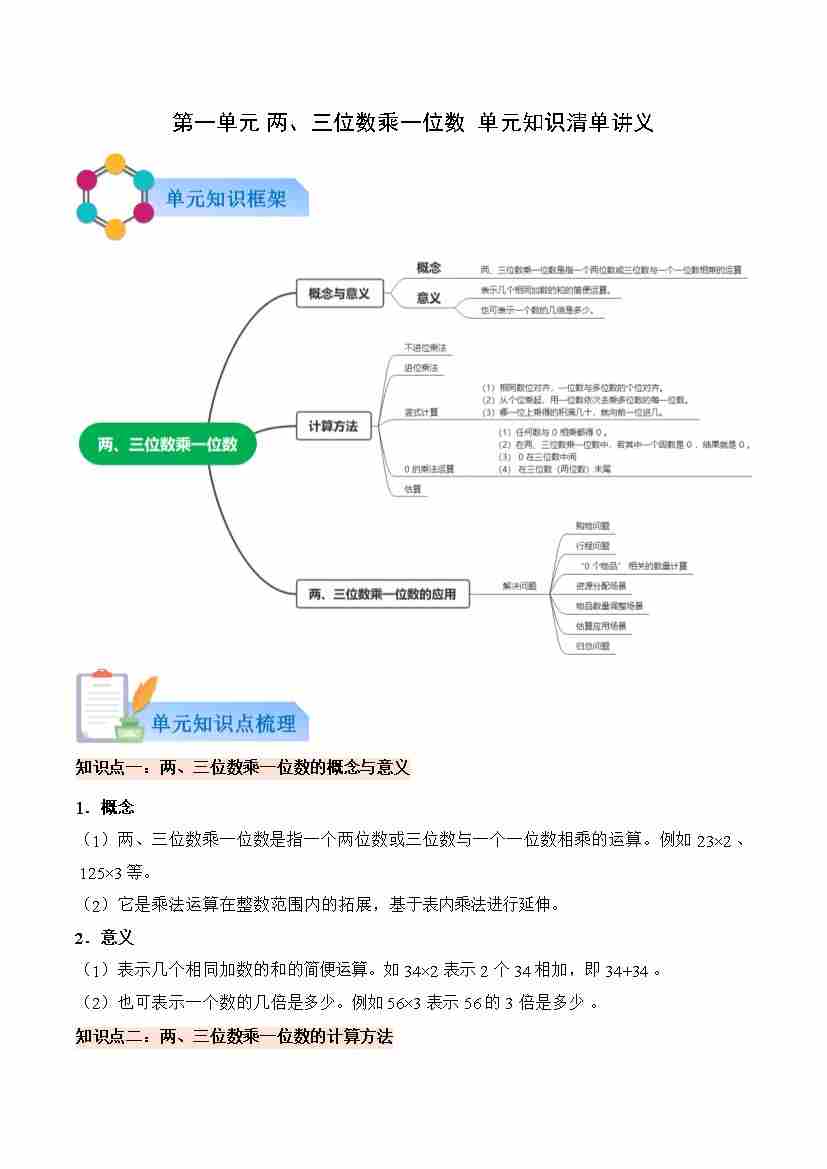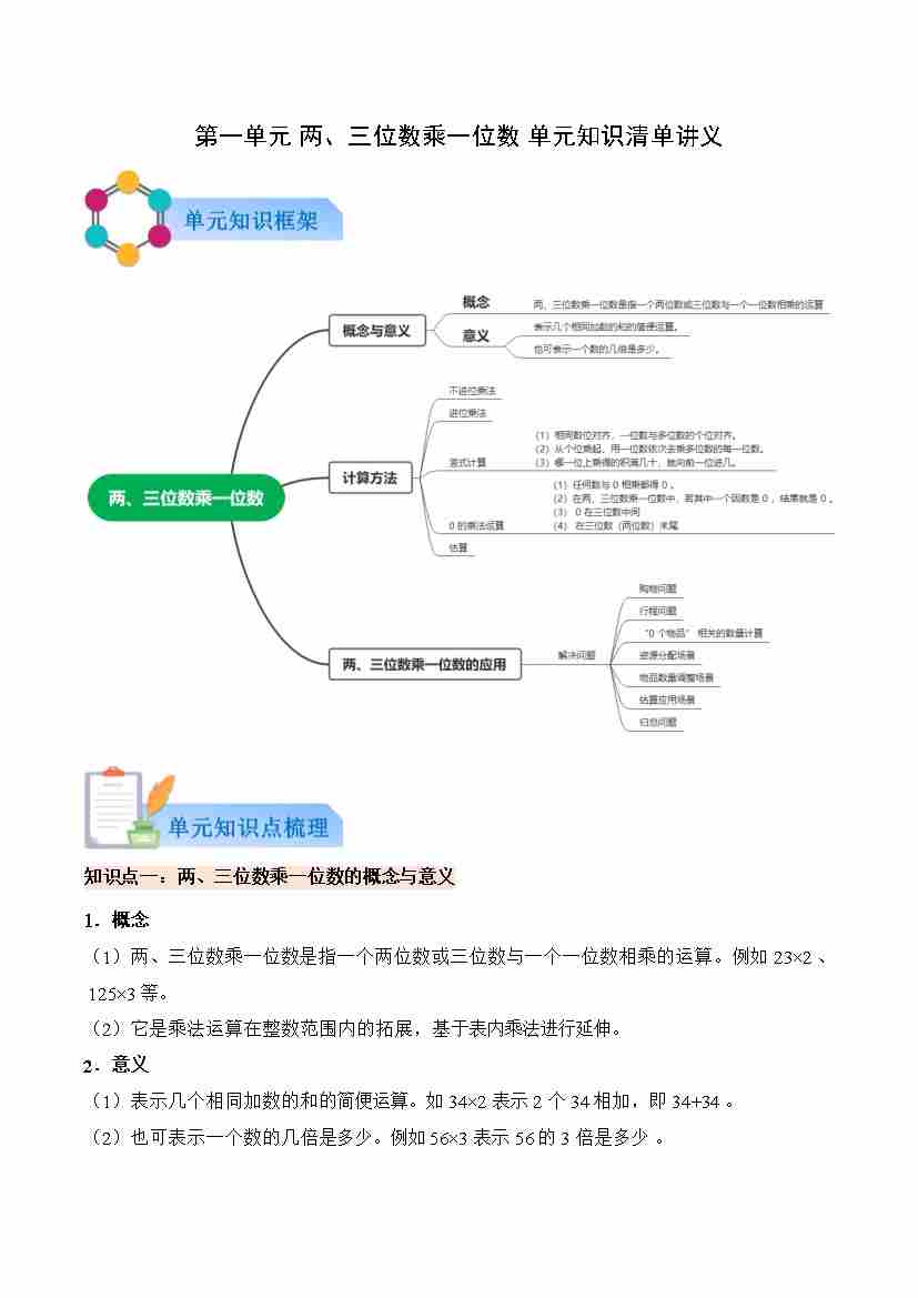 第一单元 两、三位数乘一位数(知识清单)数学西师大版三年级上册(新教材)(原卷版)