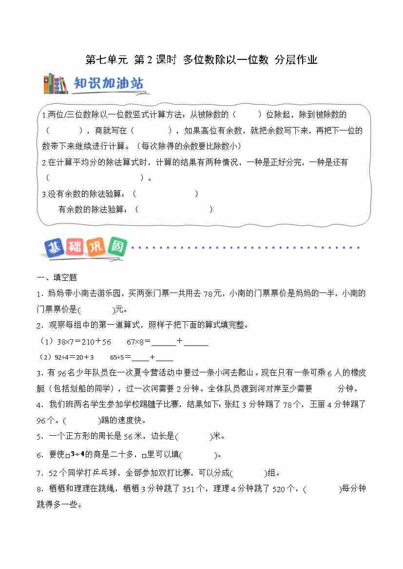 第七单元 第2课时 多位数除以一位数(首位除不尽)(分层作业)数学青岛版三年级上册(新教材)