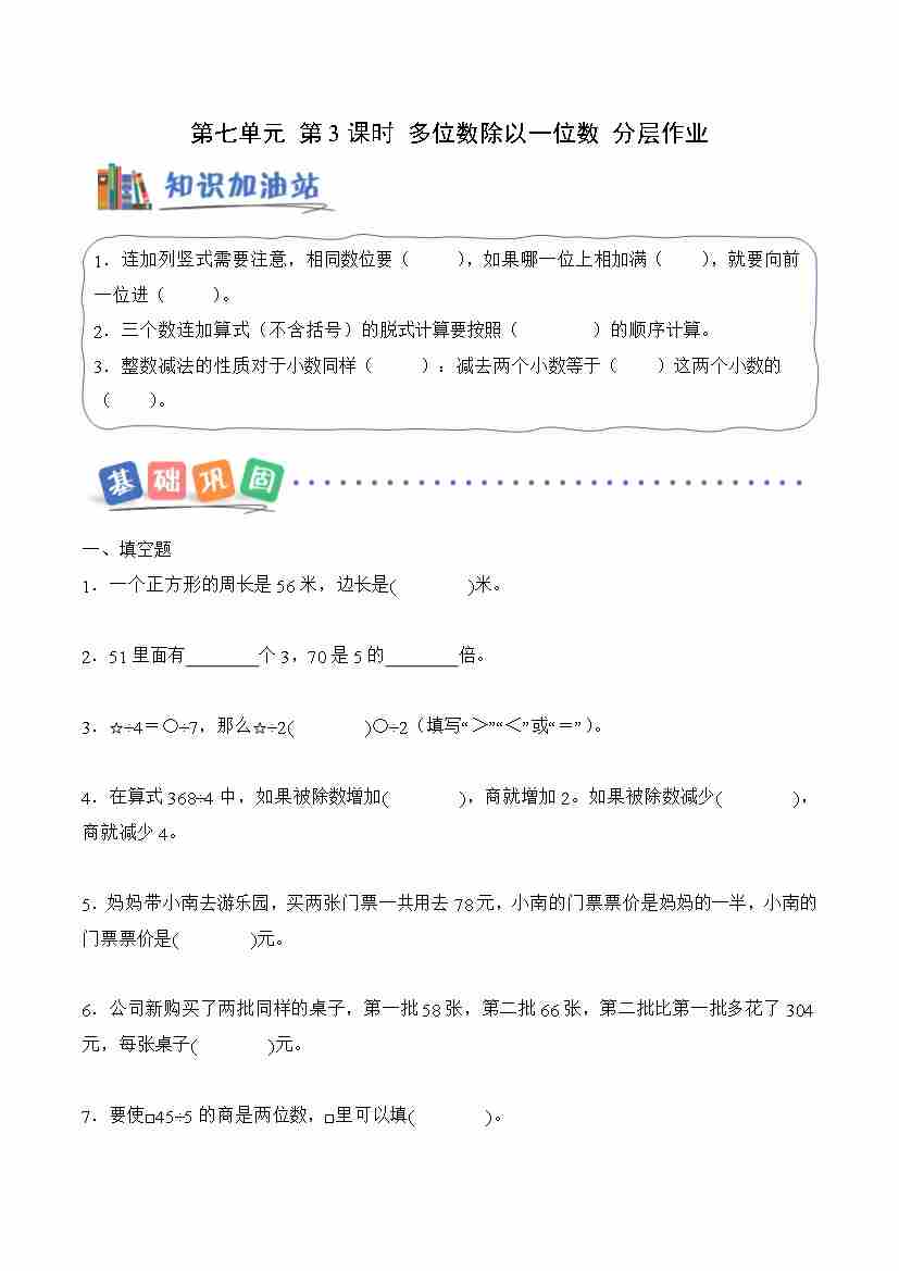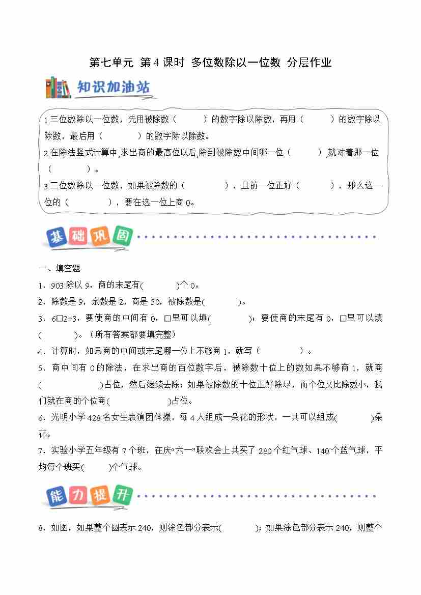 第七单元 第4课时 多位数除以一位数(商中间、末尾有0)(分层作业)数学青岛版三年级上册(新教材)