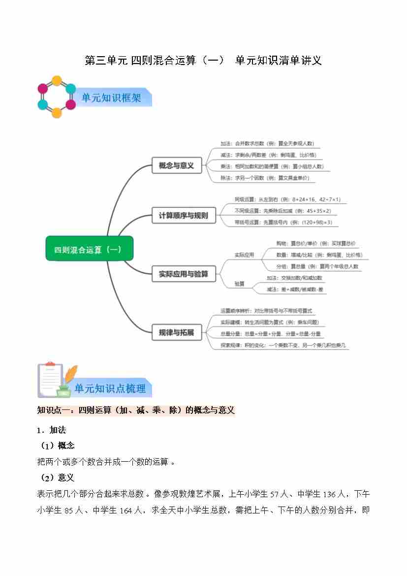 第三单元+四则混合运算(一)(知识清单)数学西师大版三年级上册(新教材)(原卷版)