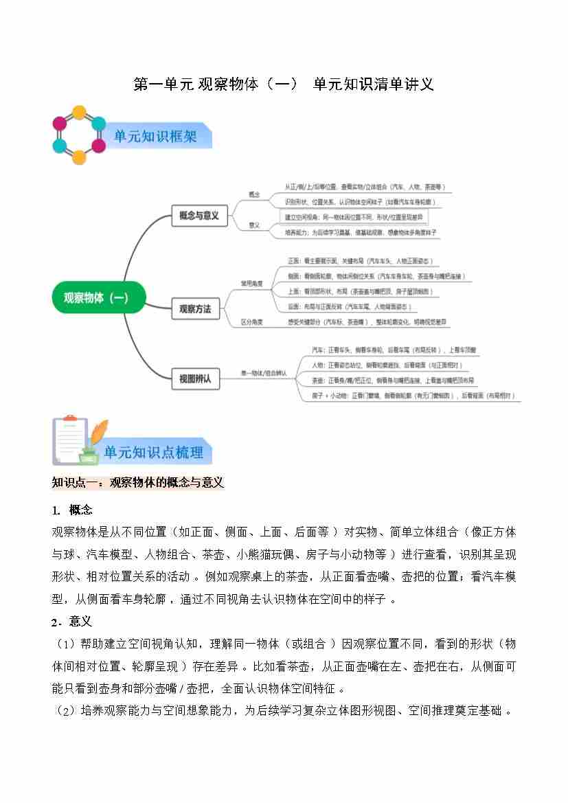 第二单元 观察物体(一)(知识清单)数学西师大版三年级上册(新教材)(原卷版)