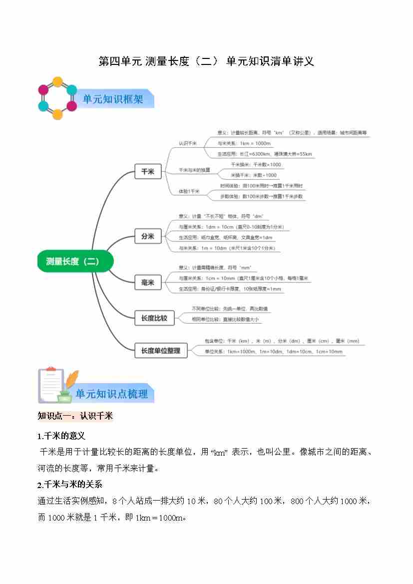 第四单元 测量长度(二)(知识清单)数学西师大版三年级上册(新教材)(原卷版)