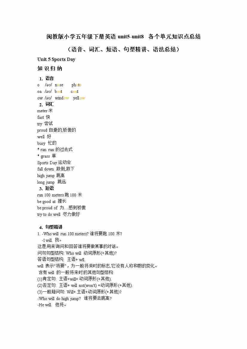 Unit 5 - Unit 8 单元知识点总结(素材)-五级下册英语