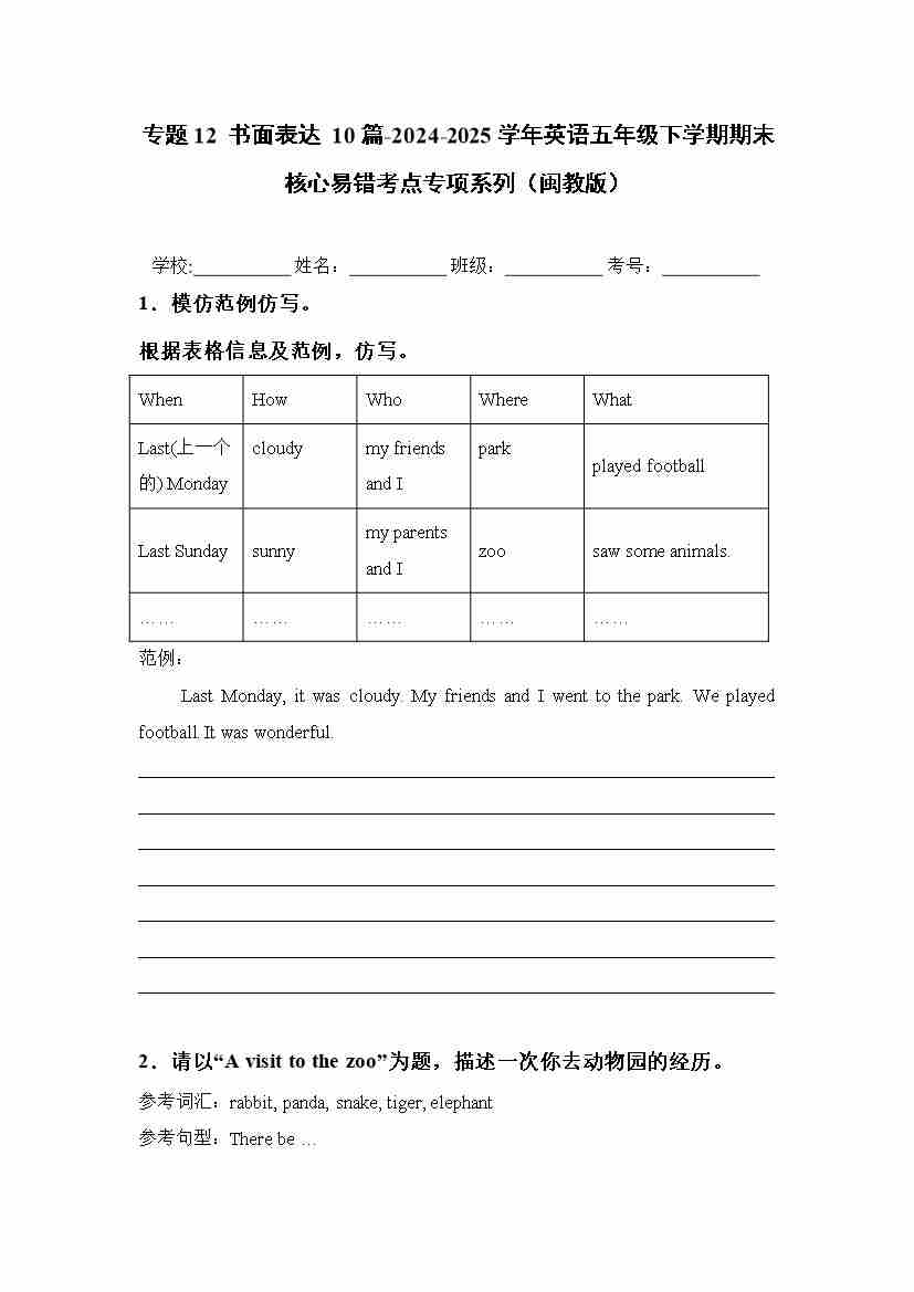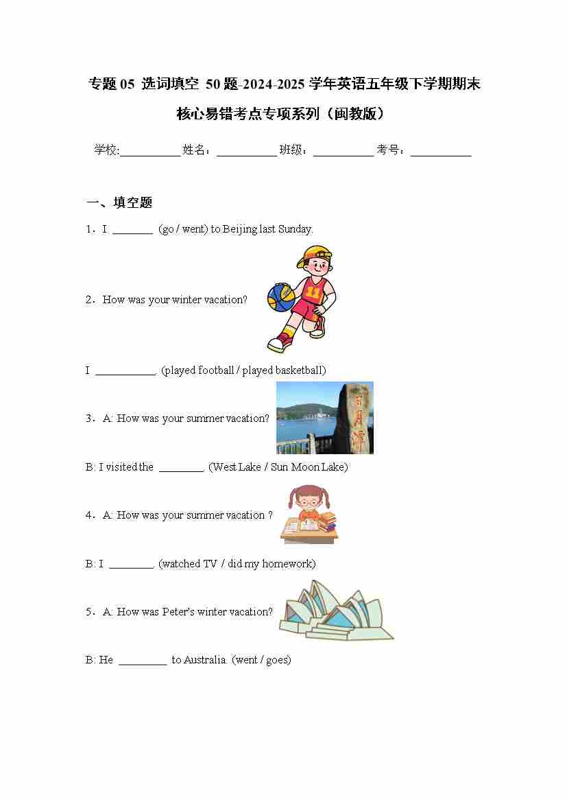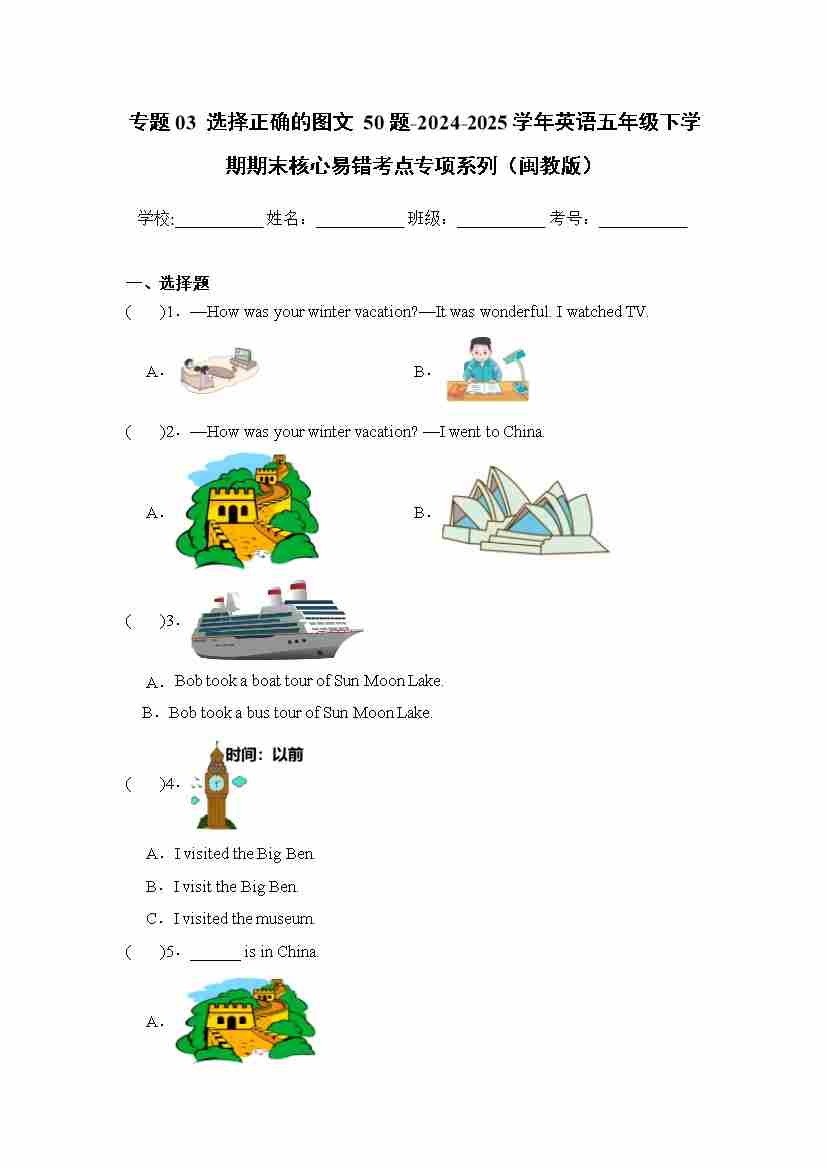 Unit 1 Winter vacation(单元测试)闽教版英语五级下册