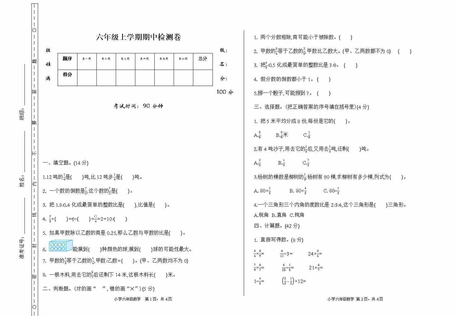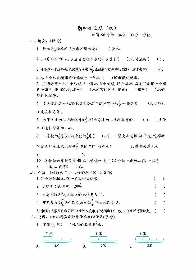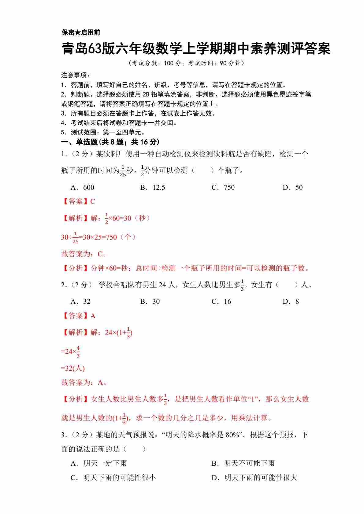 六年级(上)数学期中测评卷1答案《青岛63版》