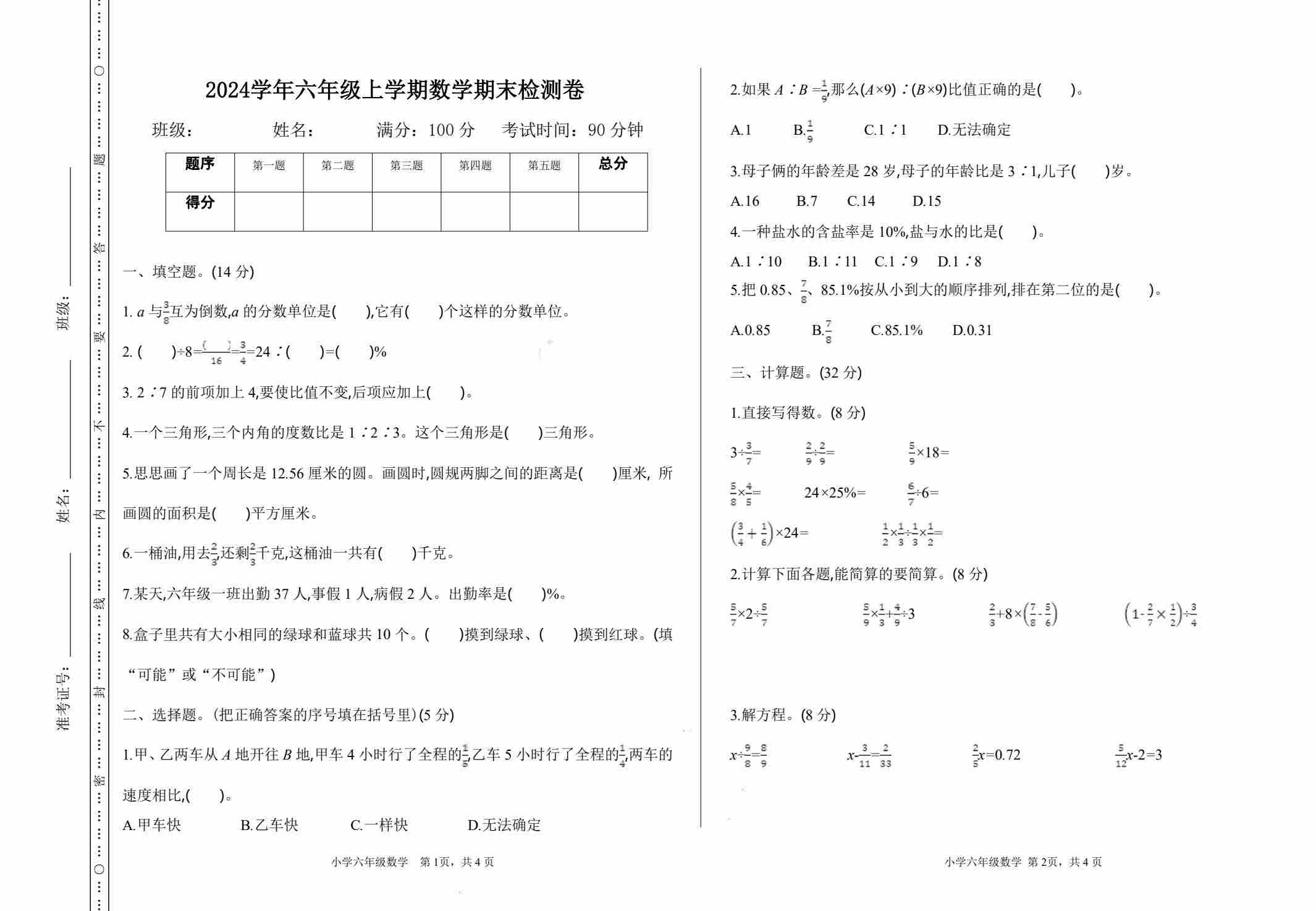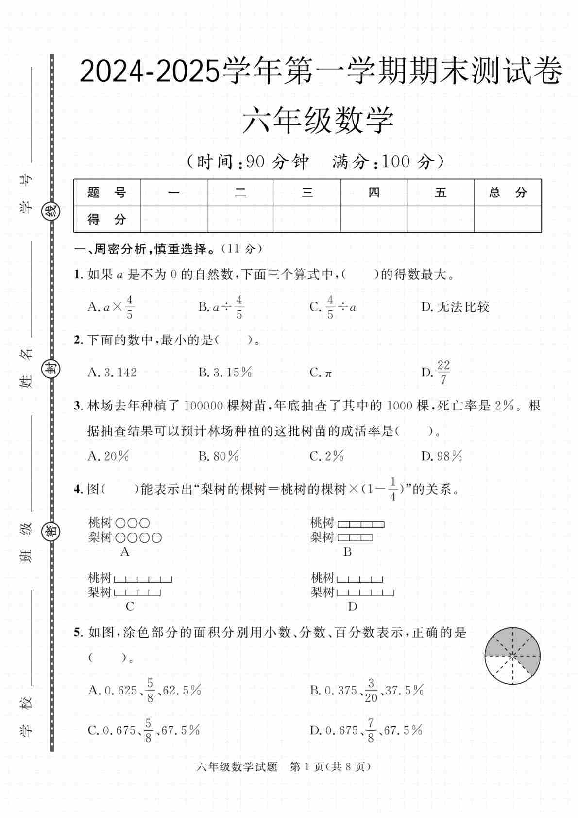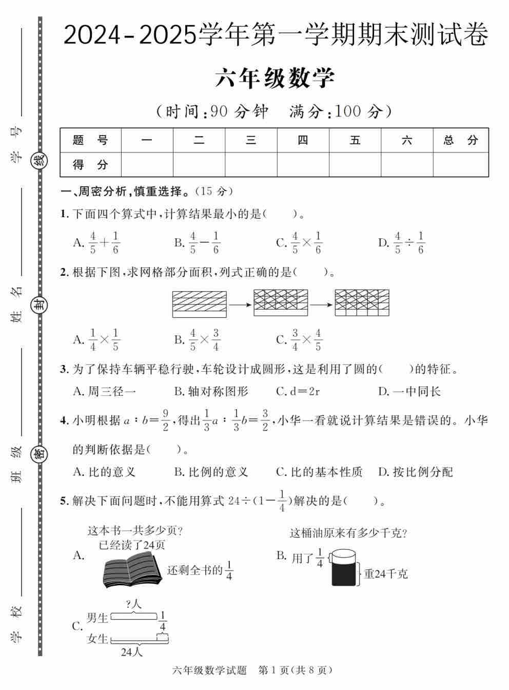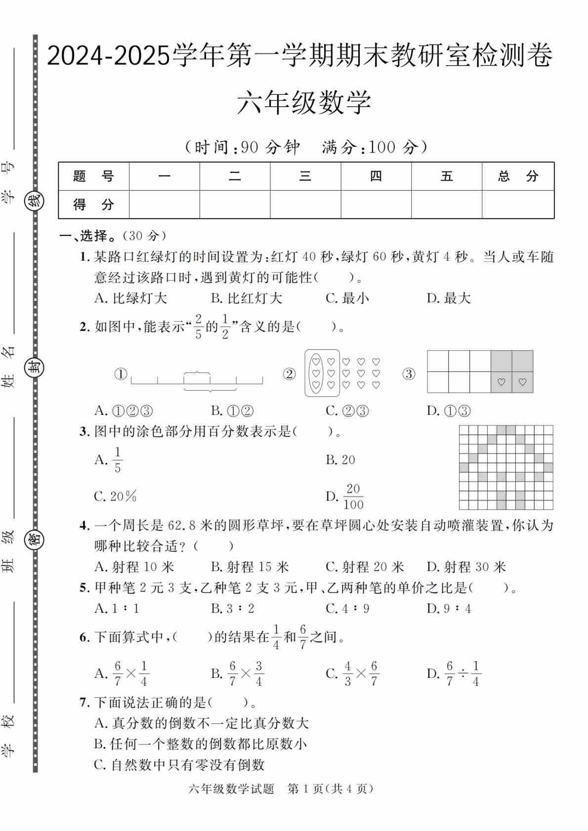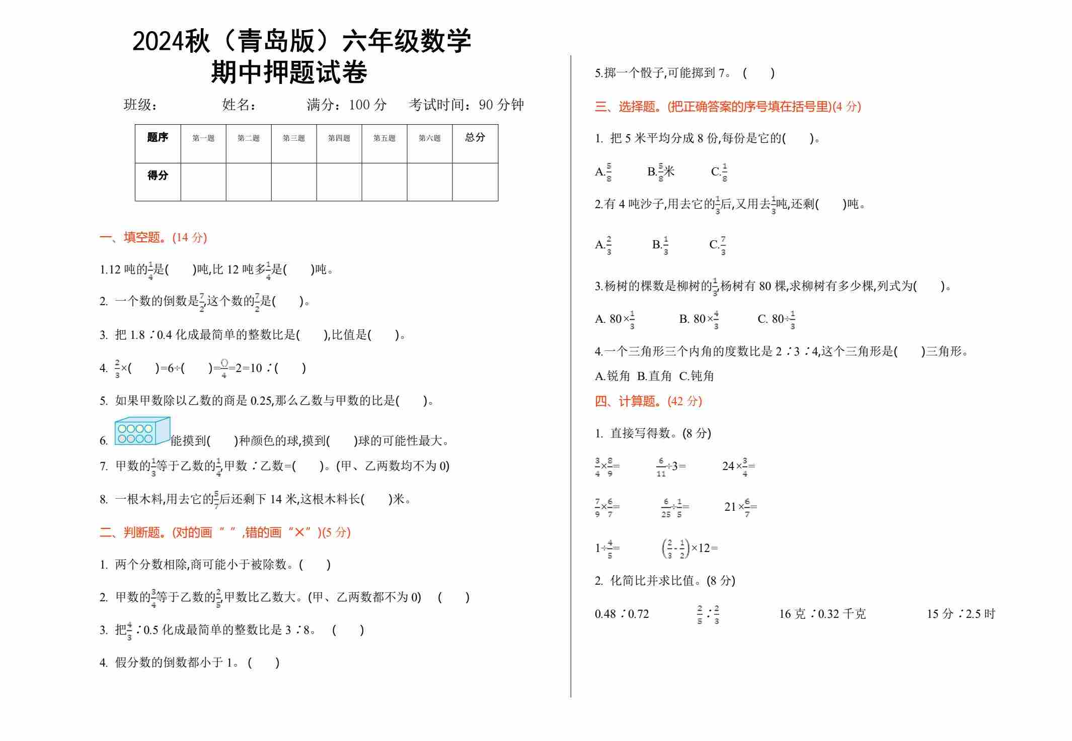 六(上)数学青岛版【2024-2025学年第一学期期末测试卷】