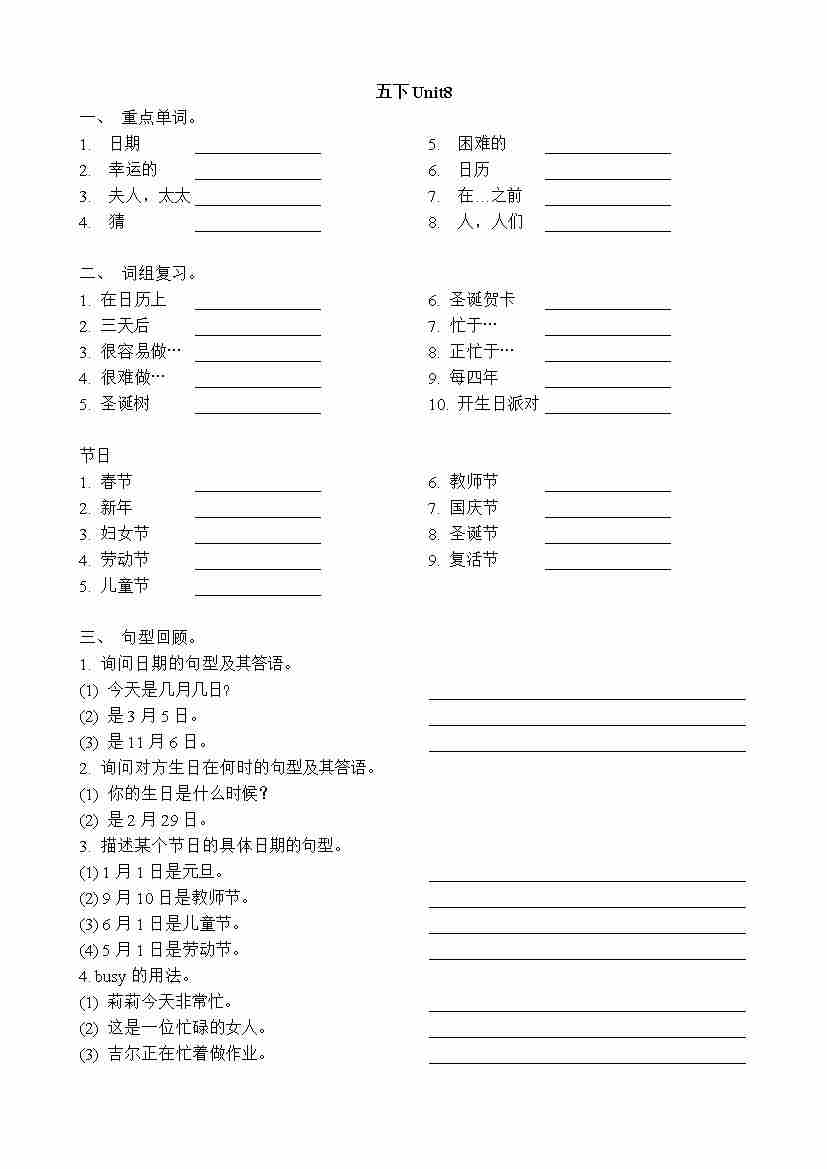 Unit 8 Dates of the Month(单元卷)闽教版英语五级下册