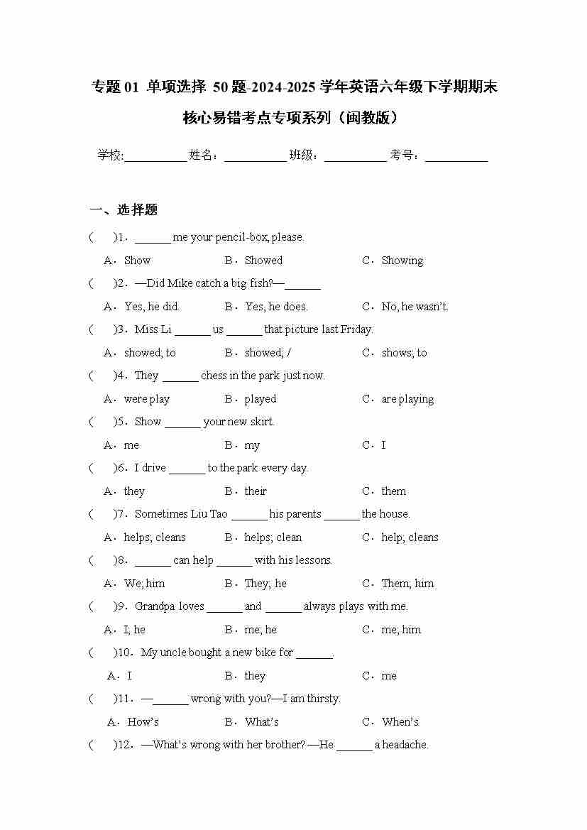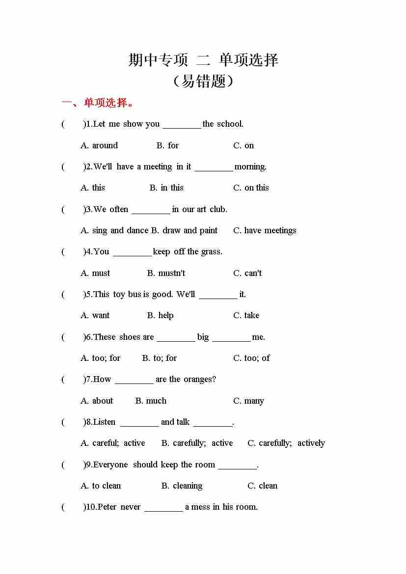 易错题专项期中专项二单项选择五年级英语下册人教精通版(三起)含答案