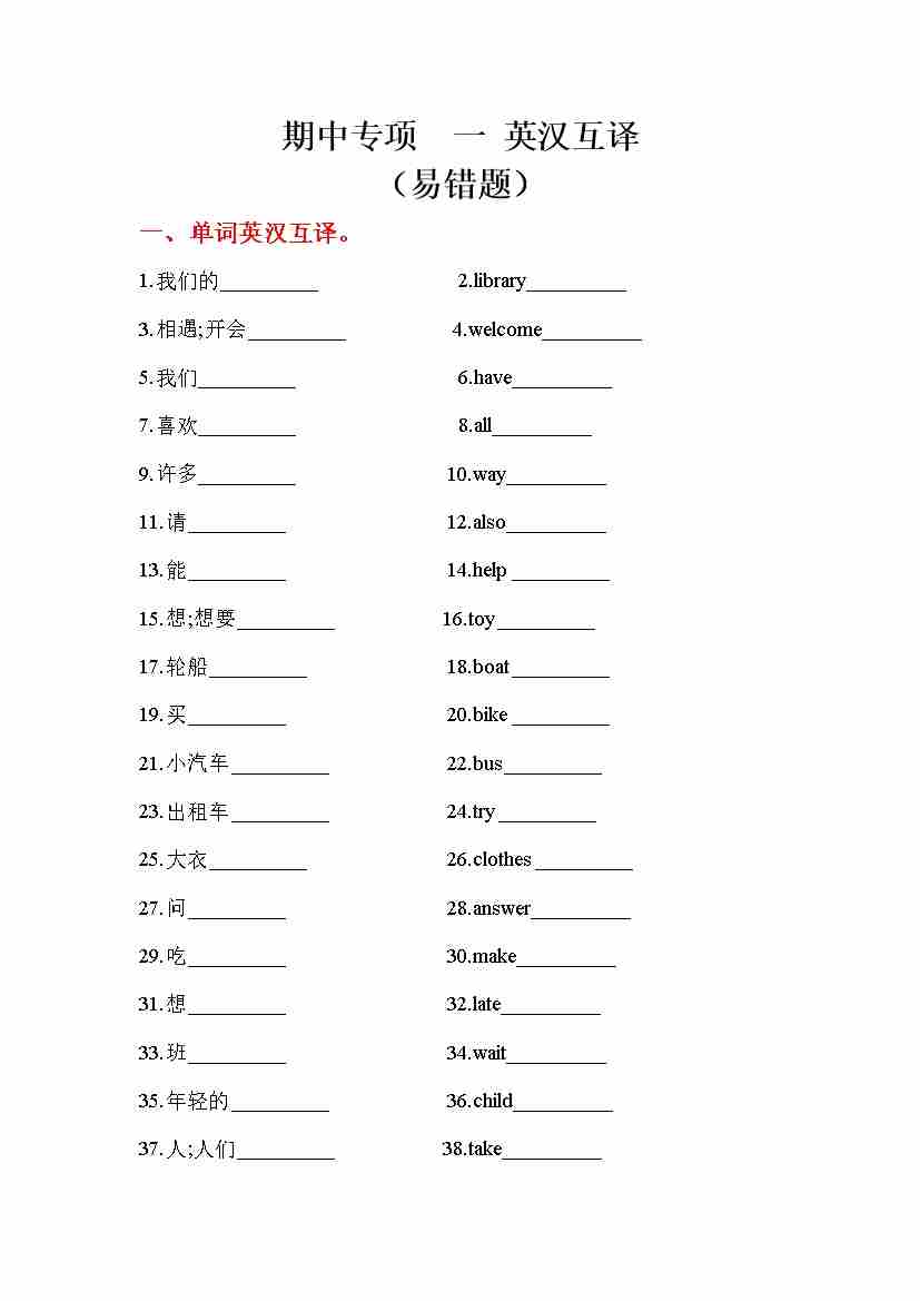 易错题专项期中专项一英汉互译五年级英语下册人教精通版(三起)含答案