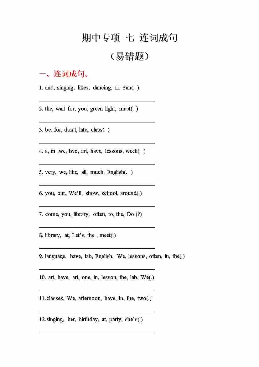 易错题专项期中专项七连词成句子五年级英语下册人教精通版(三起)含答案