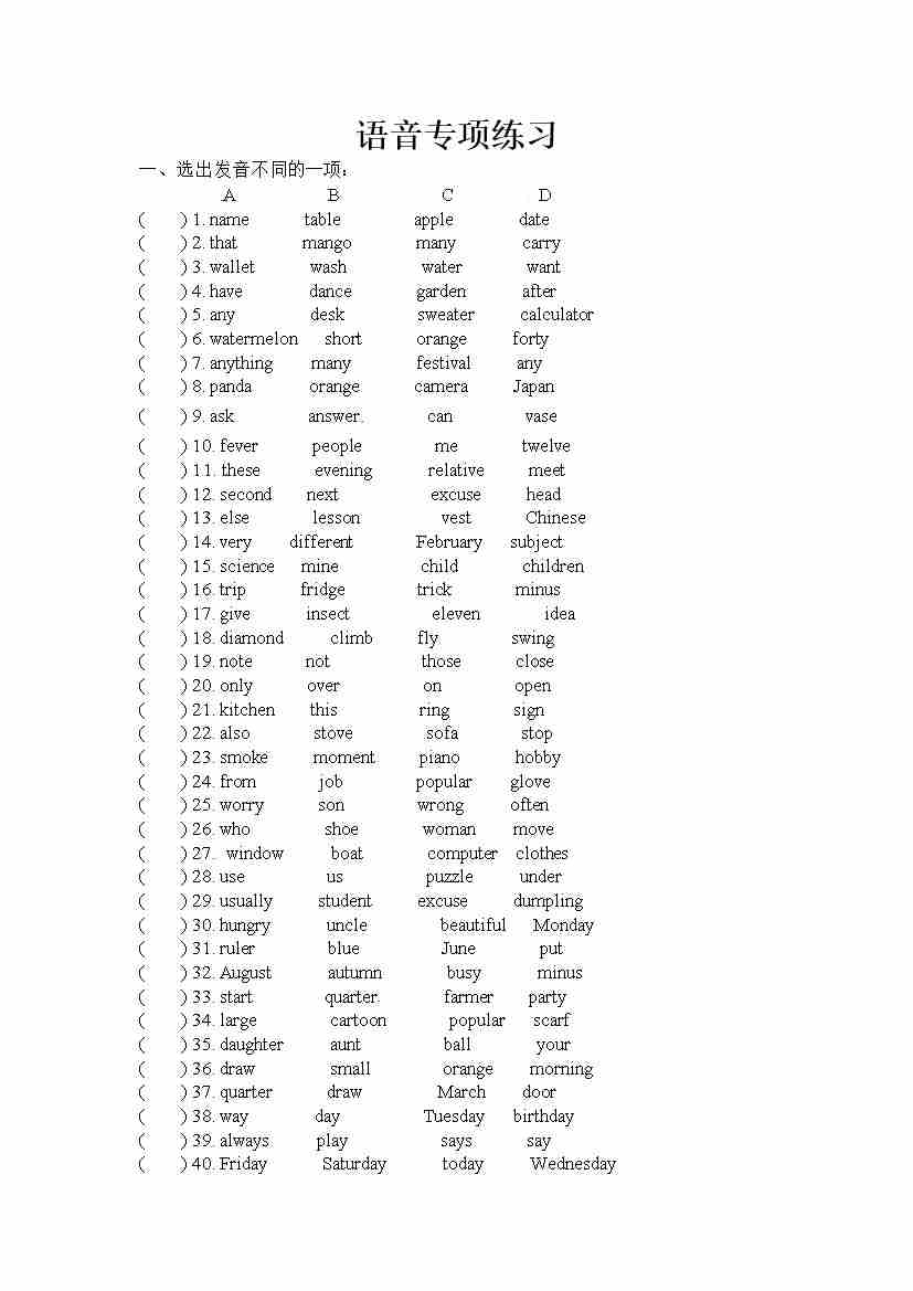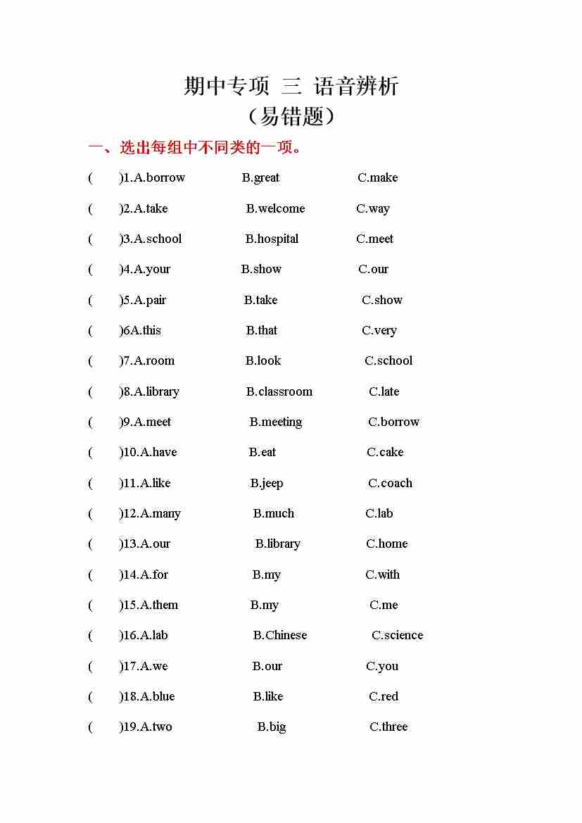 易错题专项期中专项三语音辨析五年级英语下册人教精通版(三起)含答案