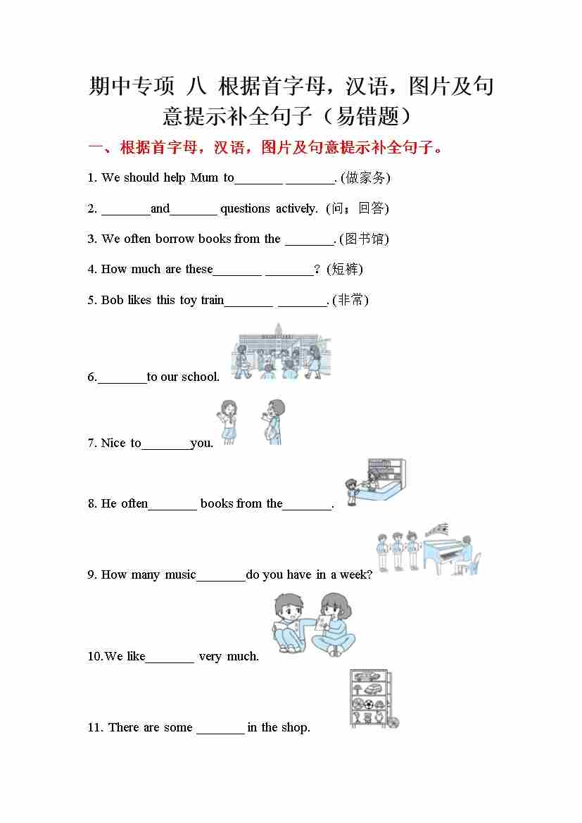 易错题专项期中专项八根据首字母,汉语,图片及句意提示补全句子五年级英语下册人教精通版(三起)含答案