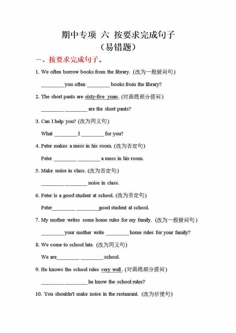易错题专项期中专项六按要求完成句子五年级英语下册人教精通版(三起)含答案