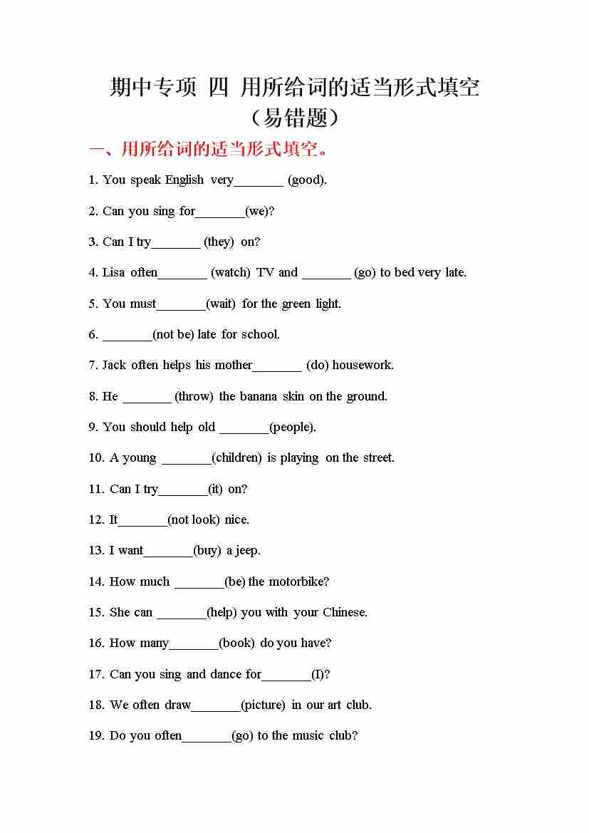 易错题专项期中专项四用所给词的适当形式填空五年级英语下册人教精通版(三起)含答案