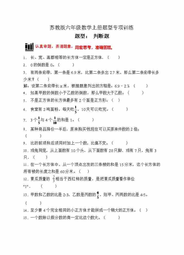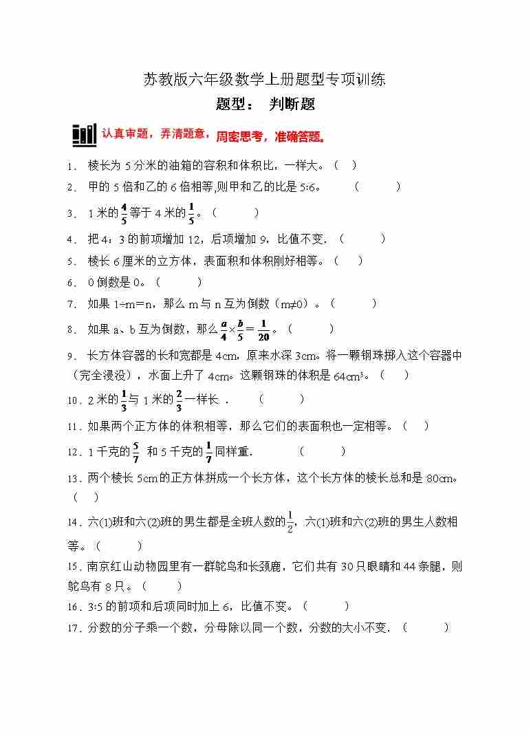 【题型专项】苏教版六年级数学上册专项复习-判断题(A卷有答案)