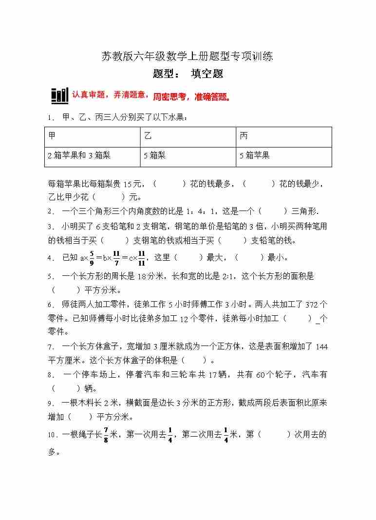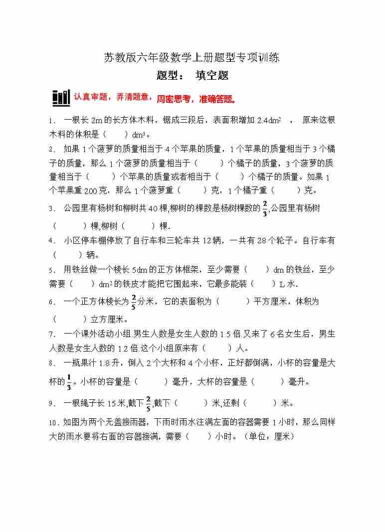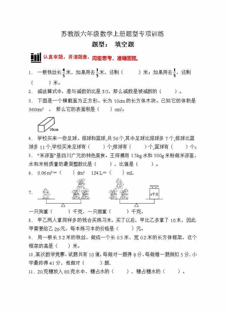 【题型专项】苏教版六年级数学上册专项复习-填空题(A卷有答案)