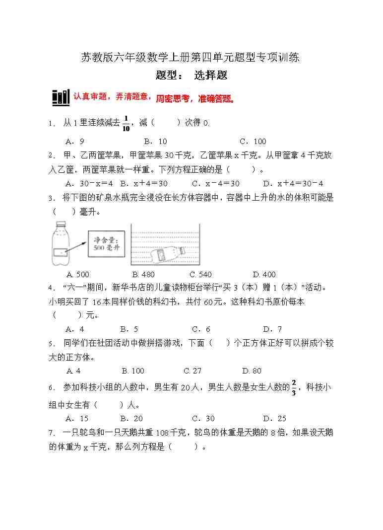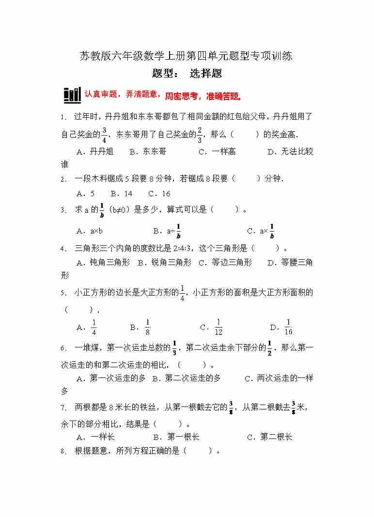 【题型专项】苏教版六年级数学上册专项复习-选择题(C卷有答案)