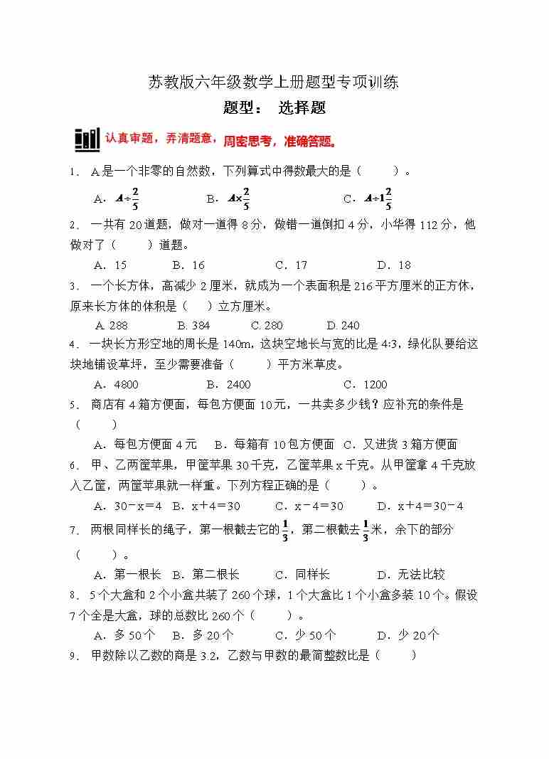 【题型专项】苏教版六年级数学上册专项复习-选择题(A卷有答案)