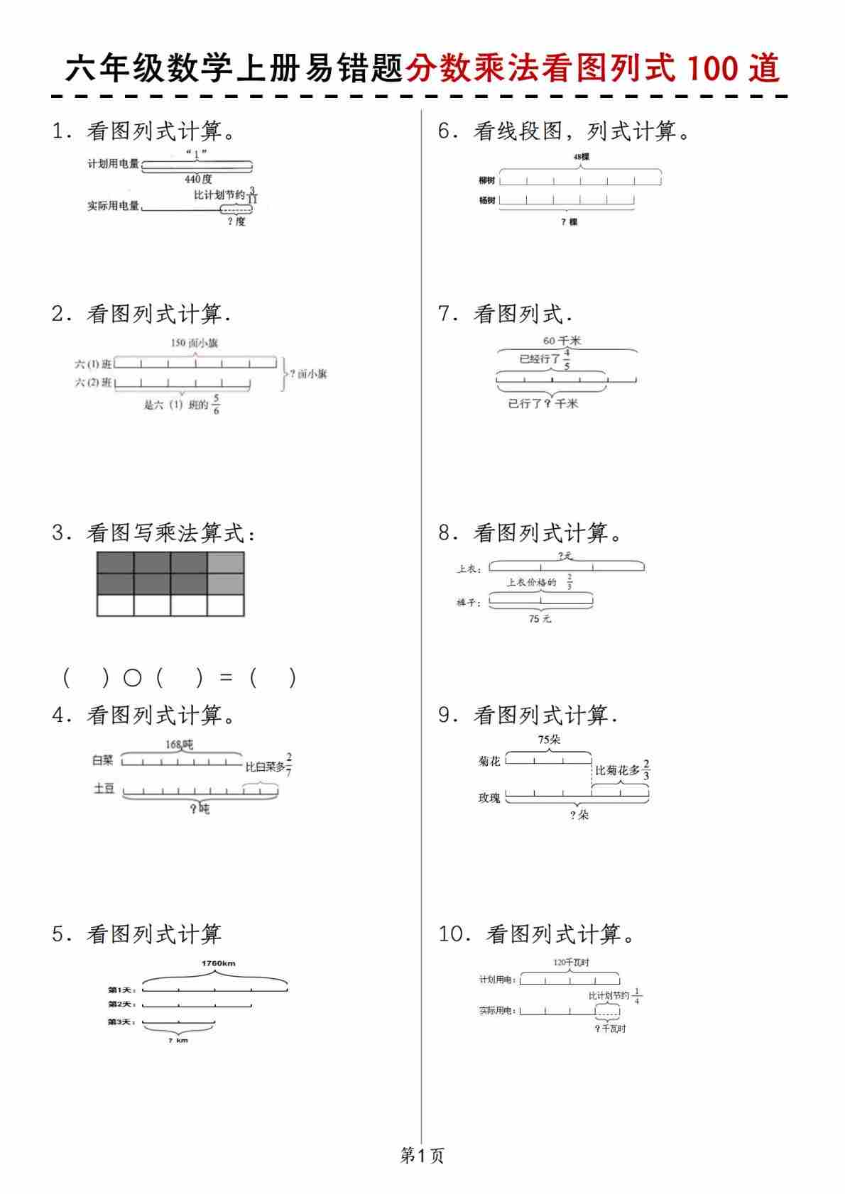 六上苏教版数学【易错题分数乘法看图列式100道】