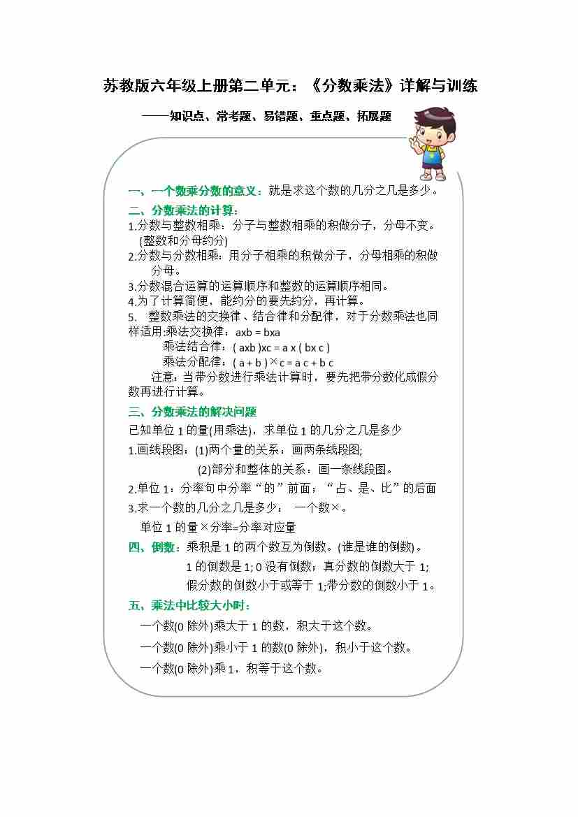 (学霸自主提优拔尖)苏教版六年级数学上册第二单元《分数乘法》(知识点、常考题、易错题、拓展题)名师详解与训练