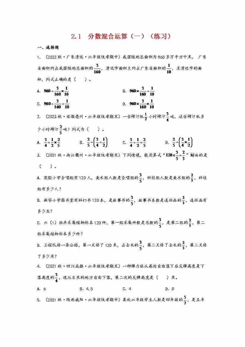 2.1 分数混合运算(一)(分层作业)
