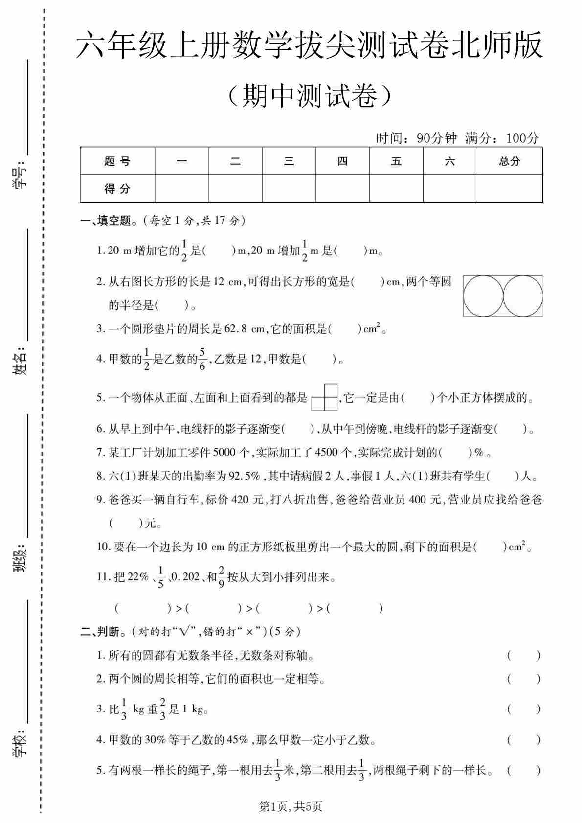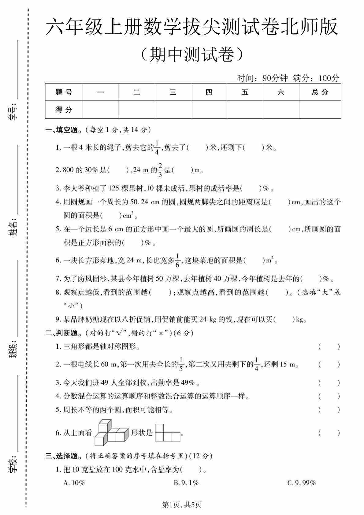 六年级(上)数学期中测试卷1《北师版》