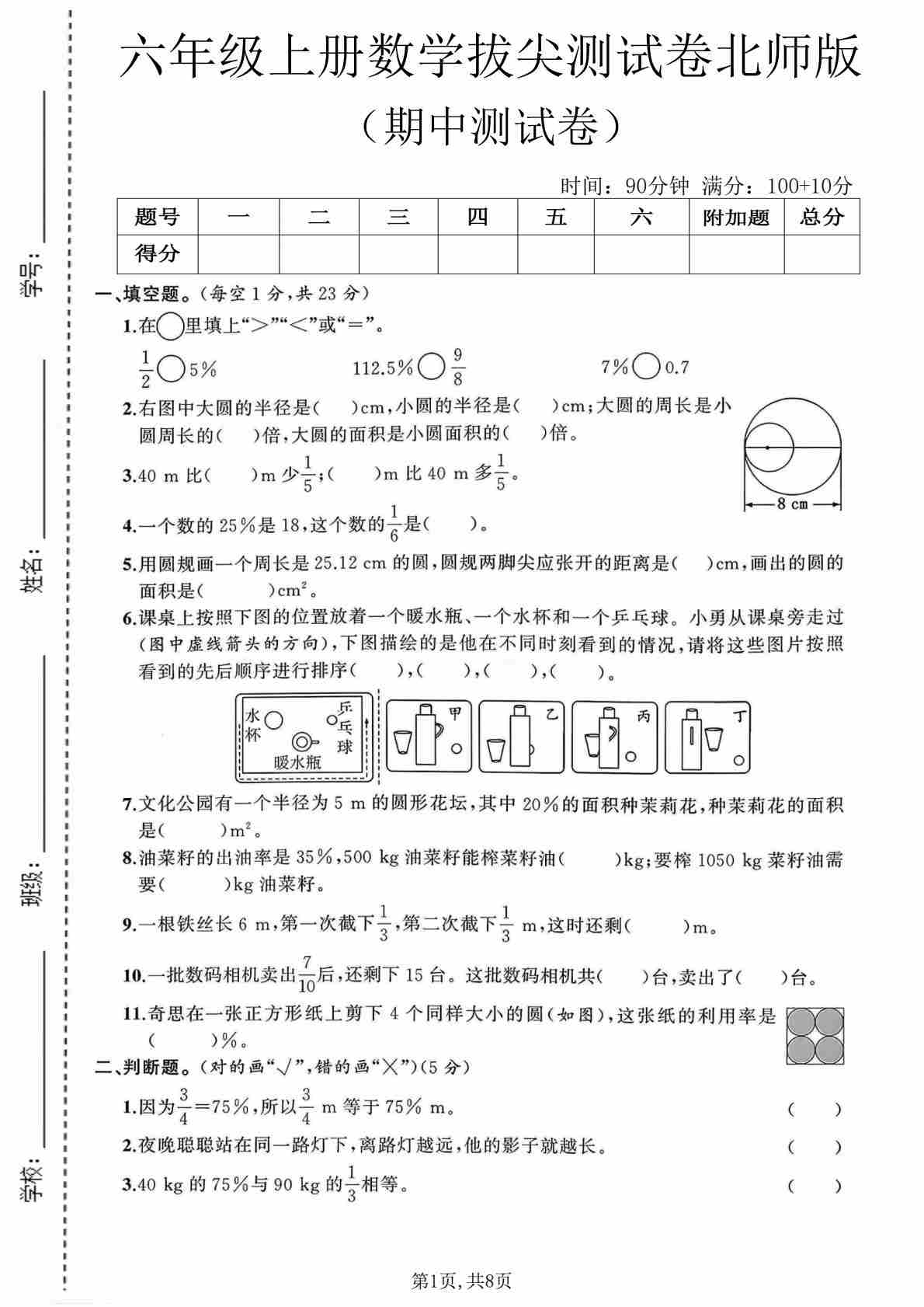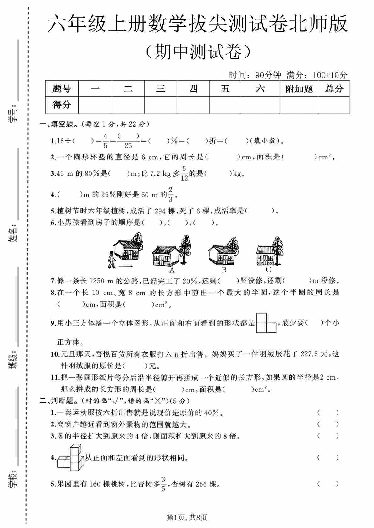 六上北师版数学【期中达标检测卷(新情景题)(一)】