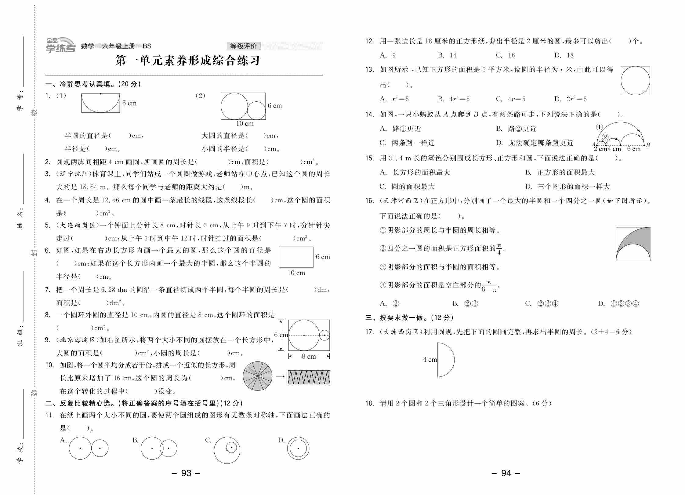 六上北师大版数学【课时《活页1+1》卷+答案】