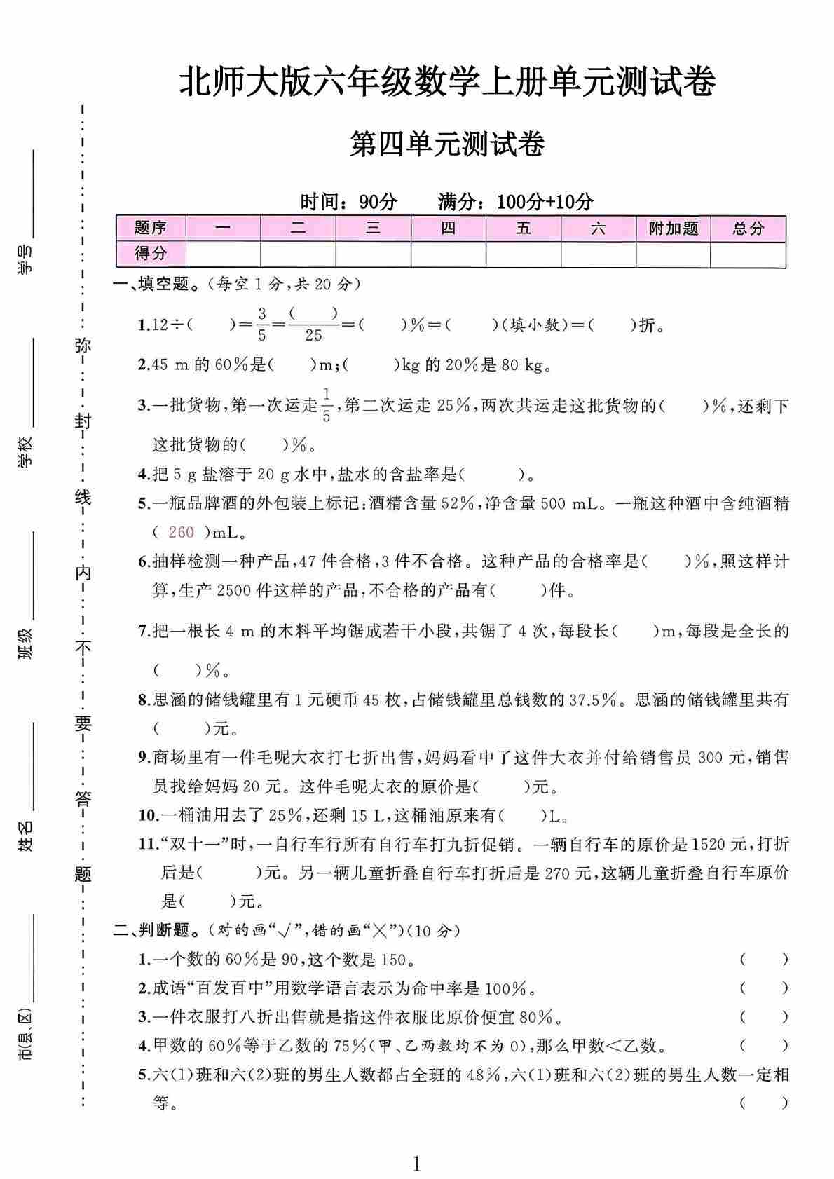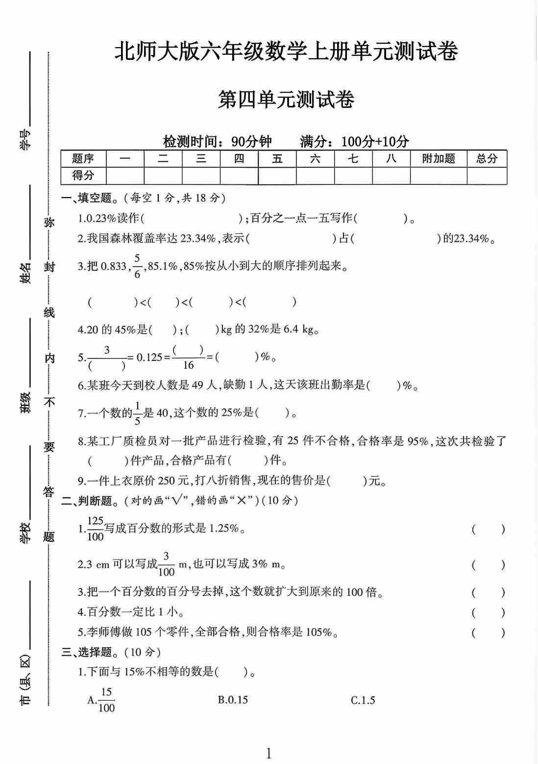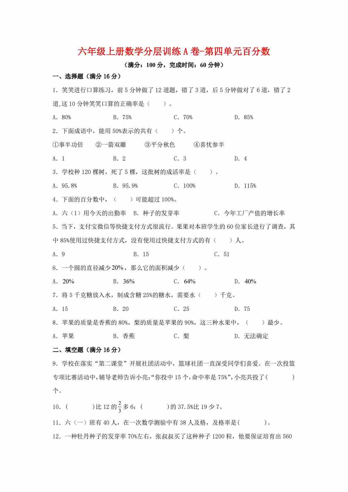 六年级(上)北师版数学第四单元百分数单元测试A卷