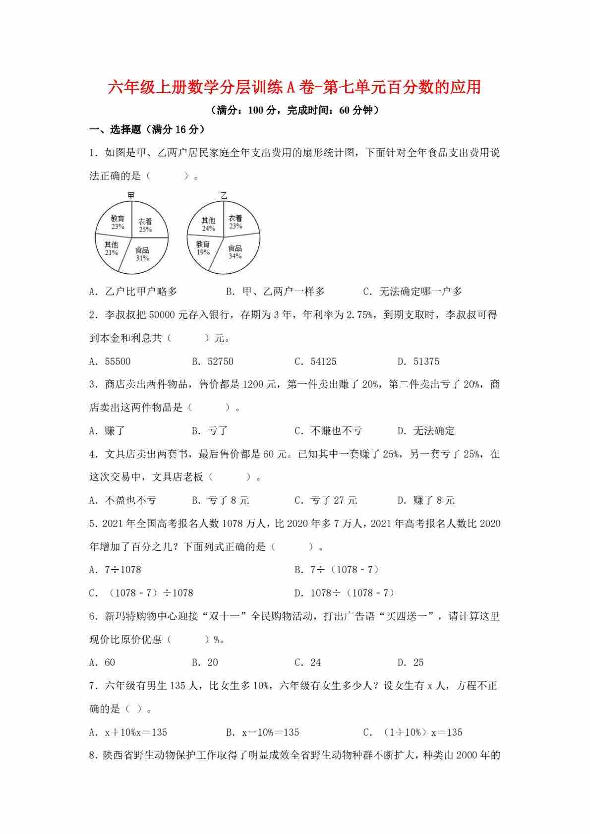 六年级(上)北师版数学第七单元百分数的应用单元测试A卷