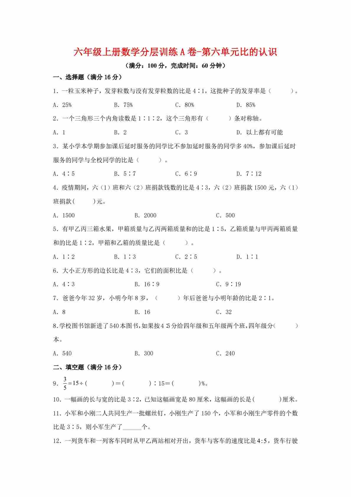 六年级(上)北师版数学第六单元比的认识单元测试A卷
