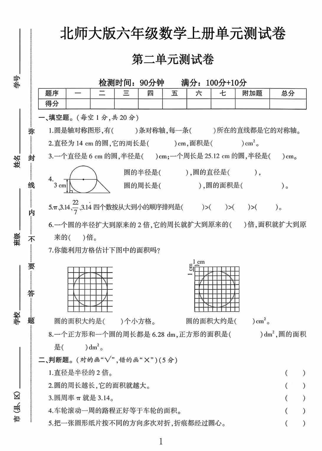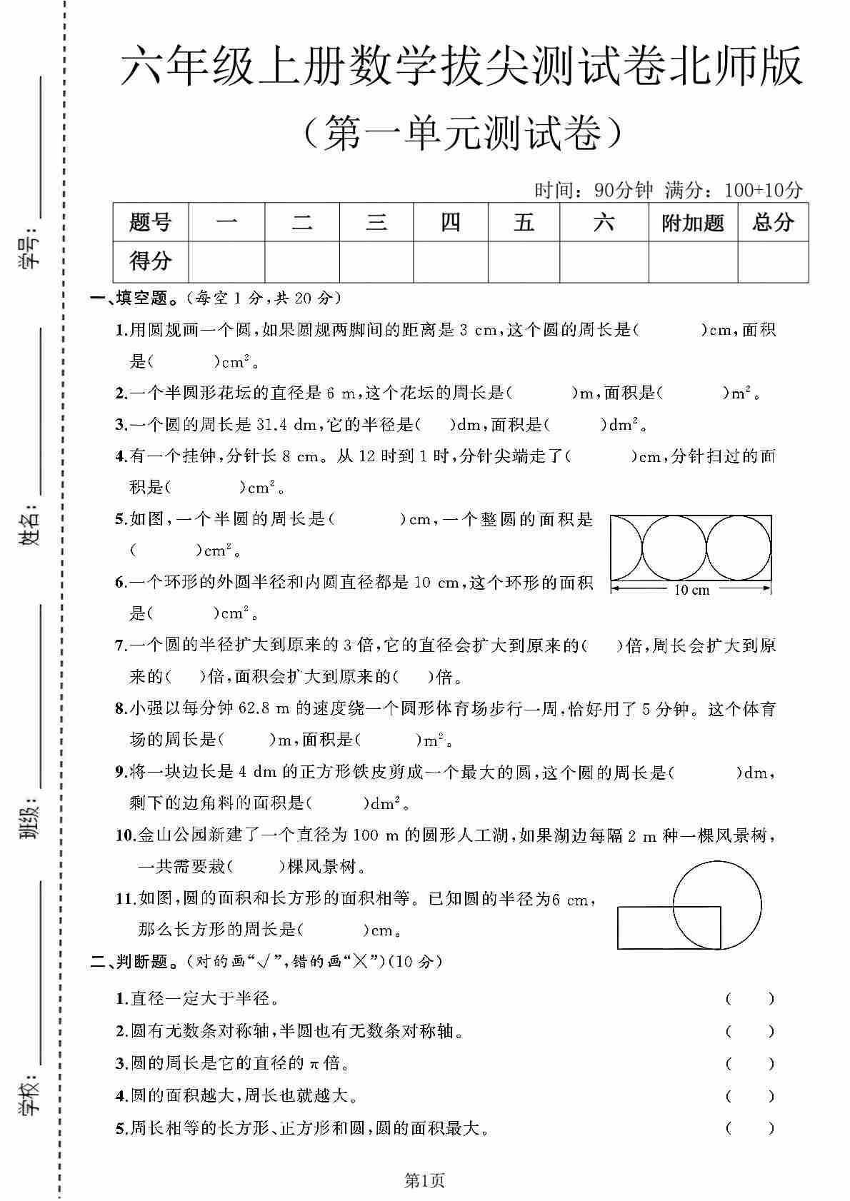 六年级(上)北师版数学第一单元圆单元测试A卷