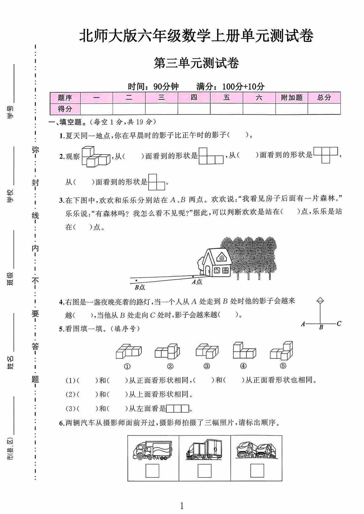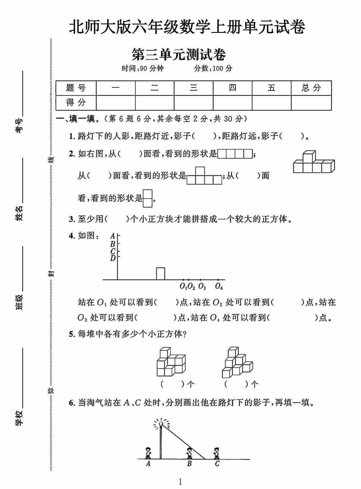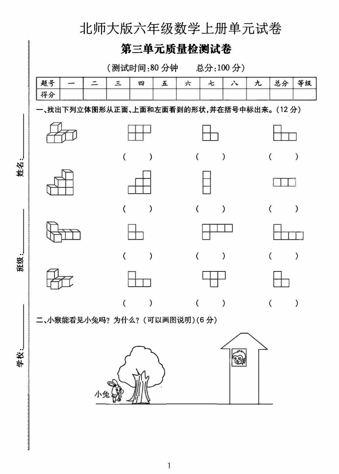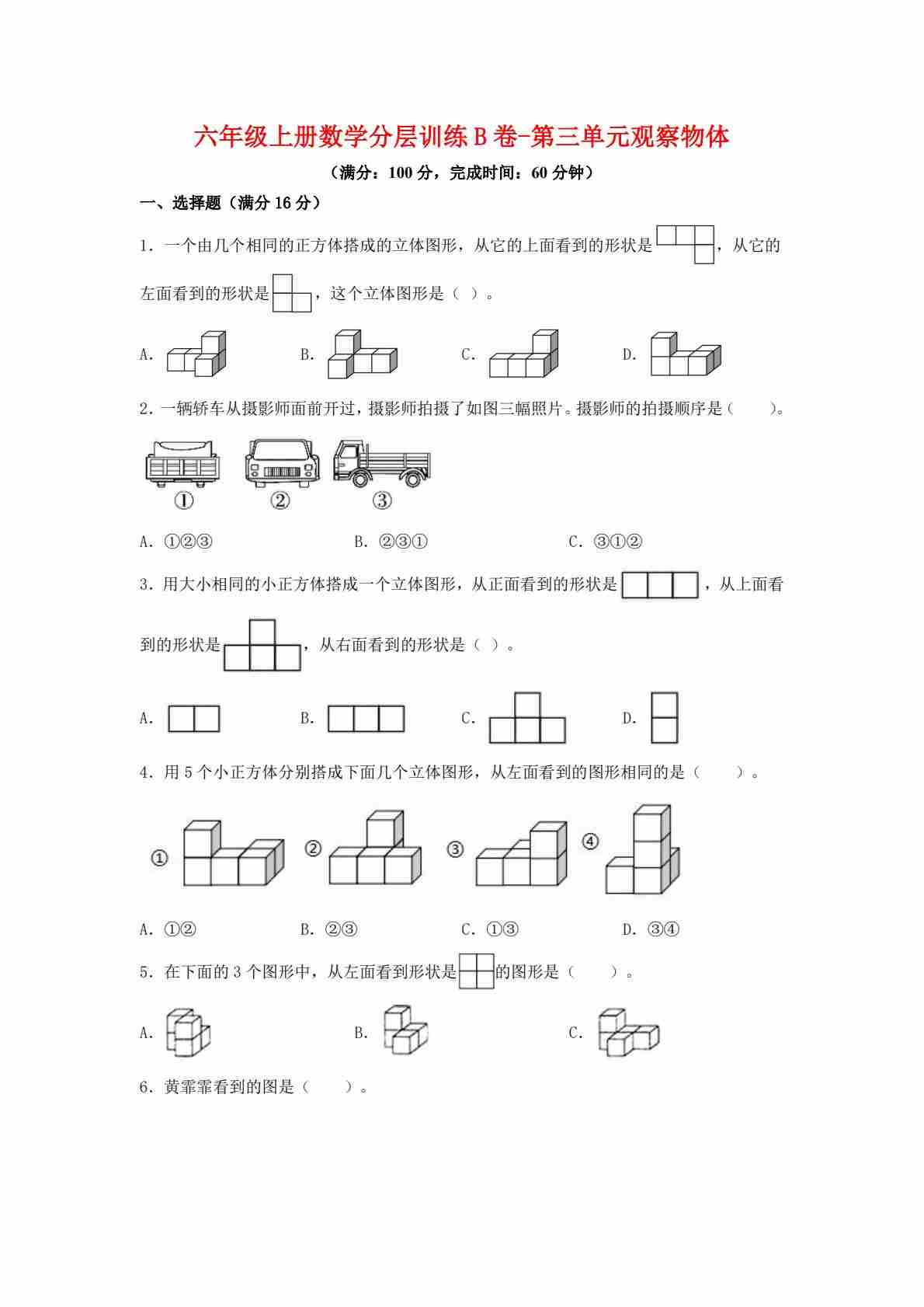 六年级(上)北师版数学第三单元观察物体单元测试B卷