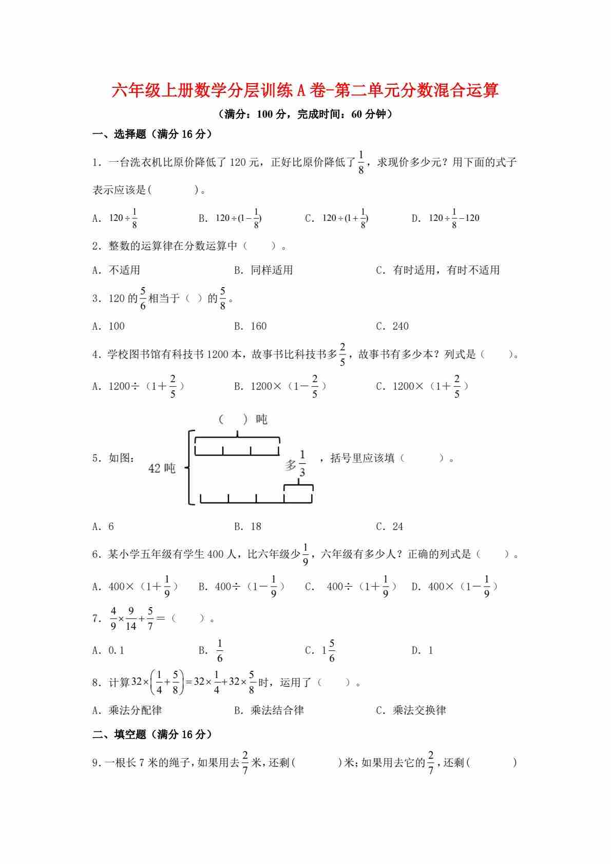 六年级(上)北师版数学第二单元分数混合运算A卷