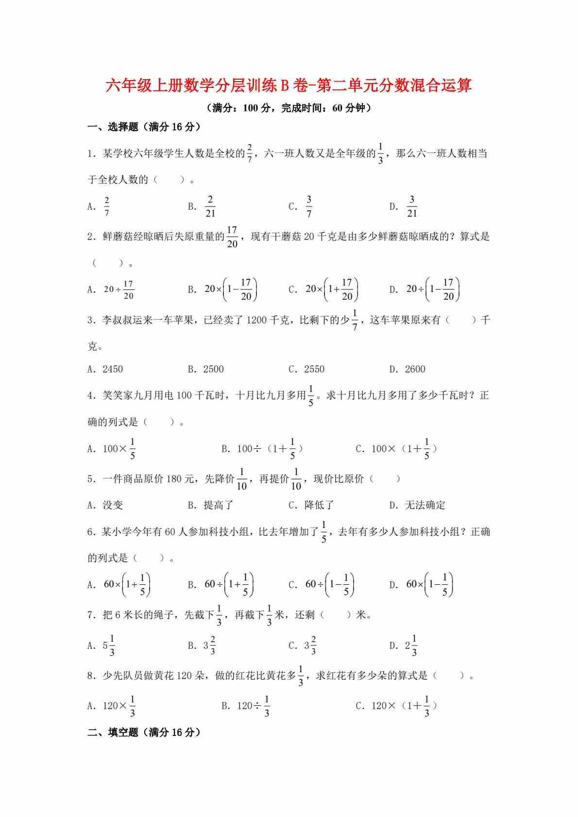 六年级(上)北师版数学第二单元分数混合运算单元测试B卷