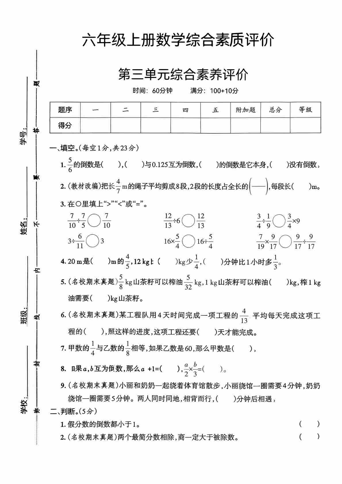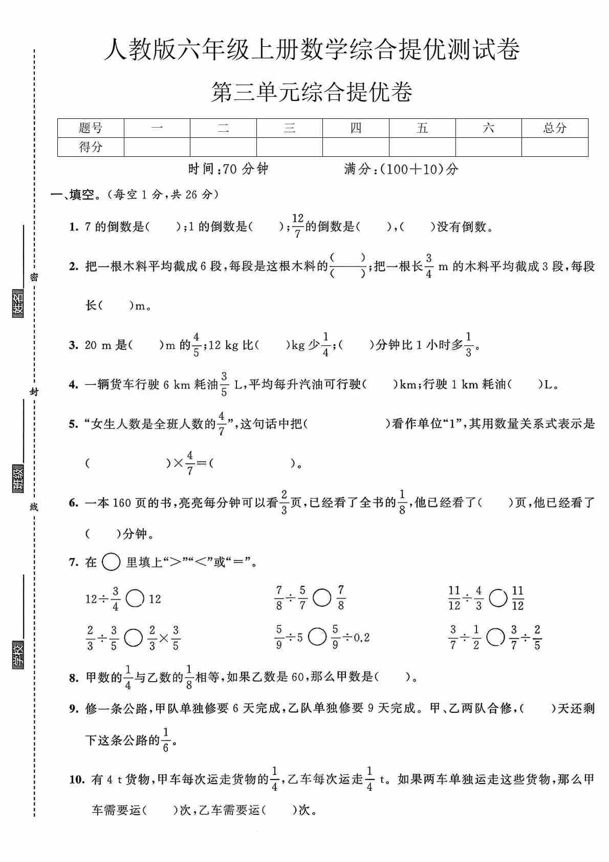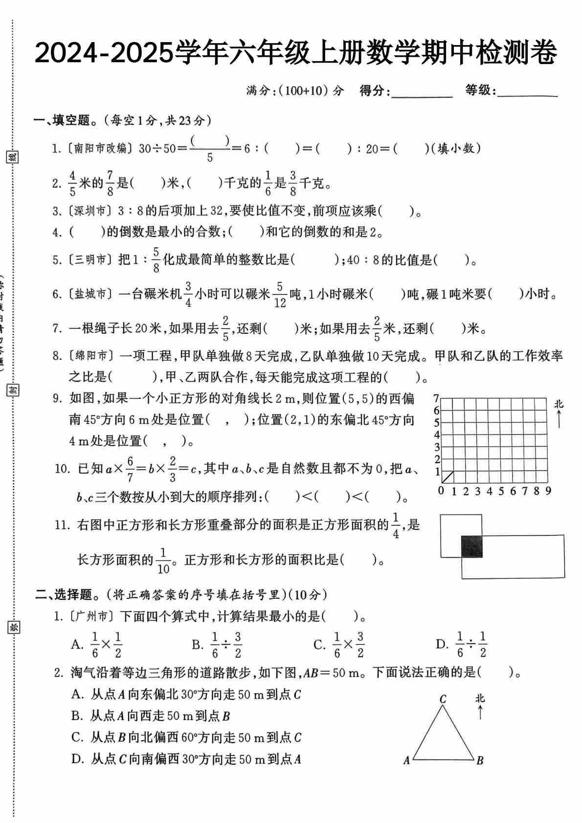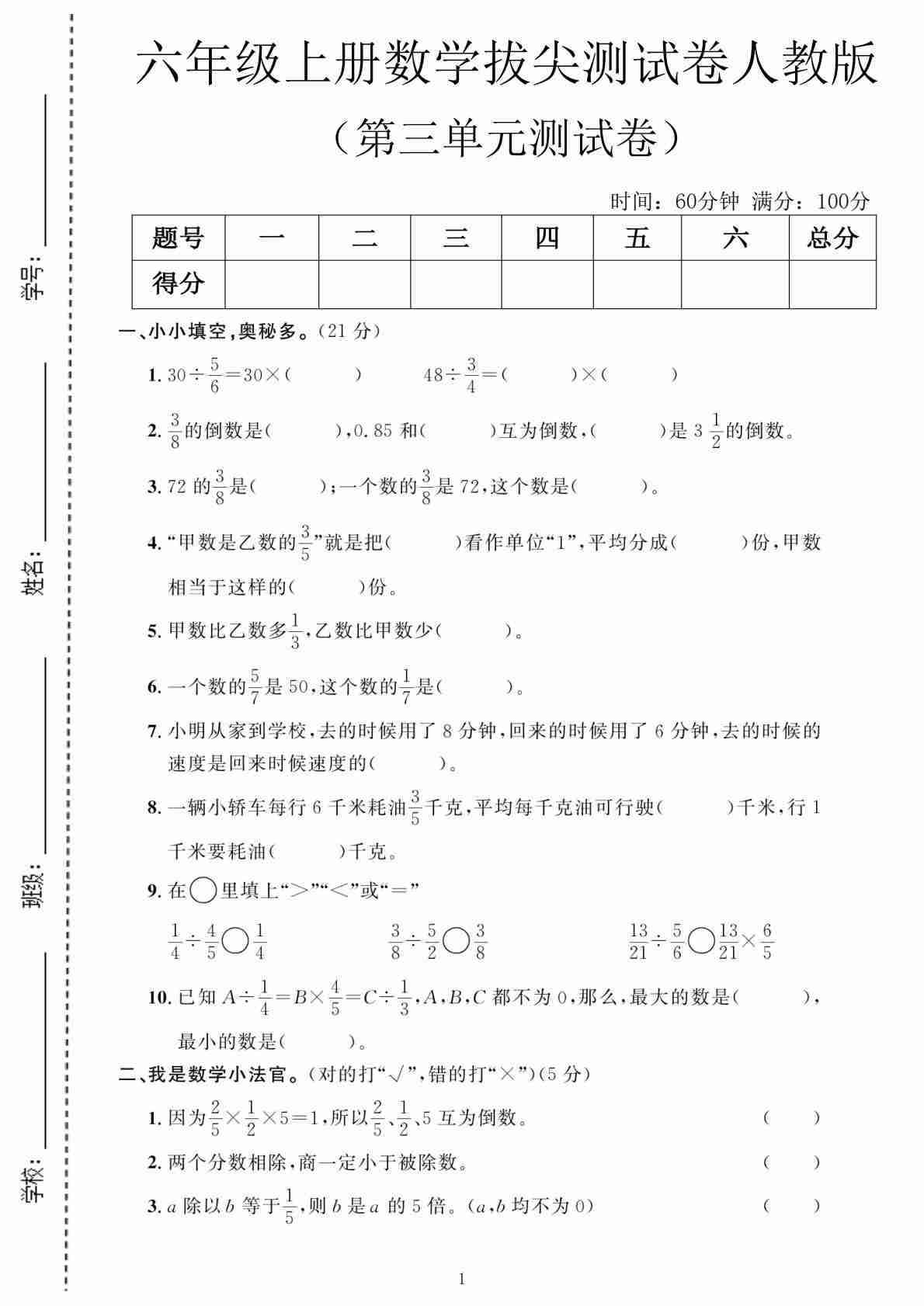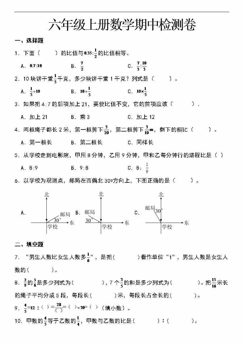 六上人教版数学【期中阶段检测卷(二)(易错篇)(含答案】)