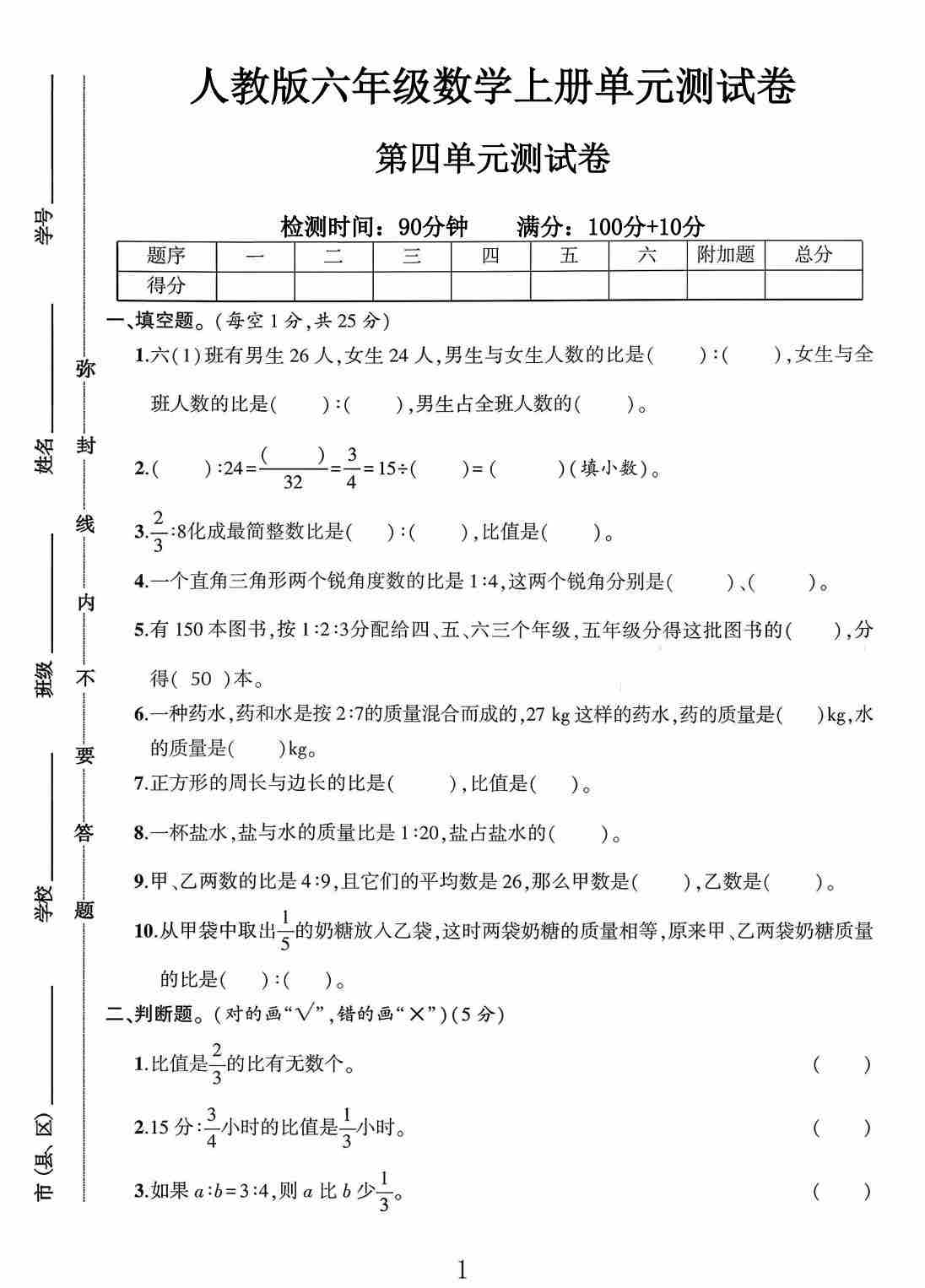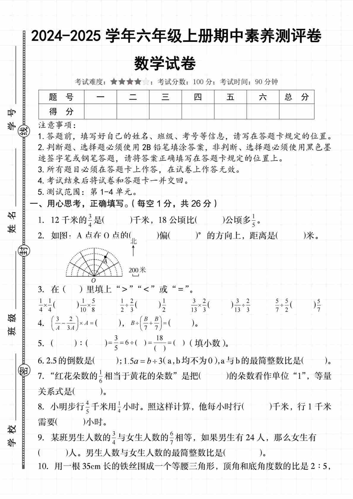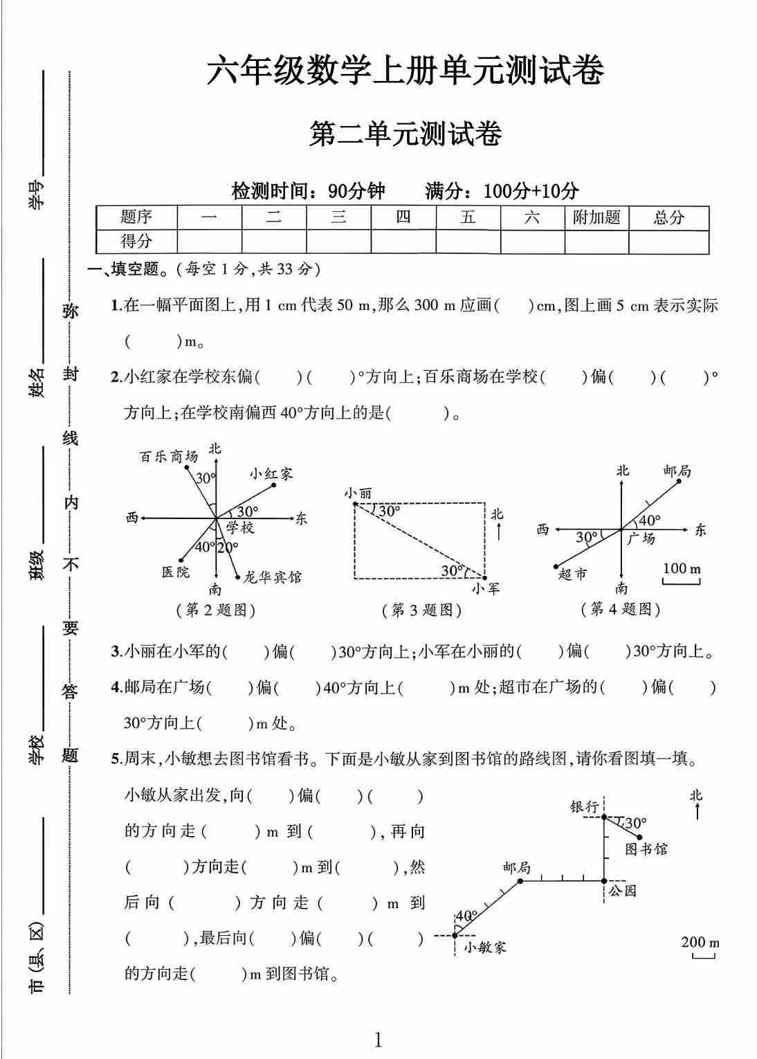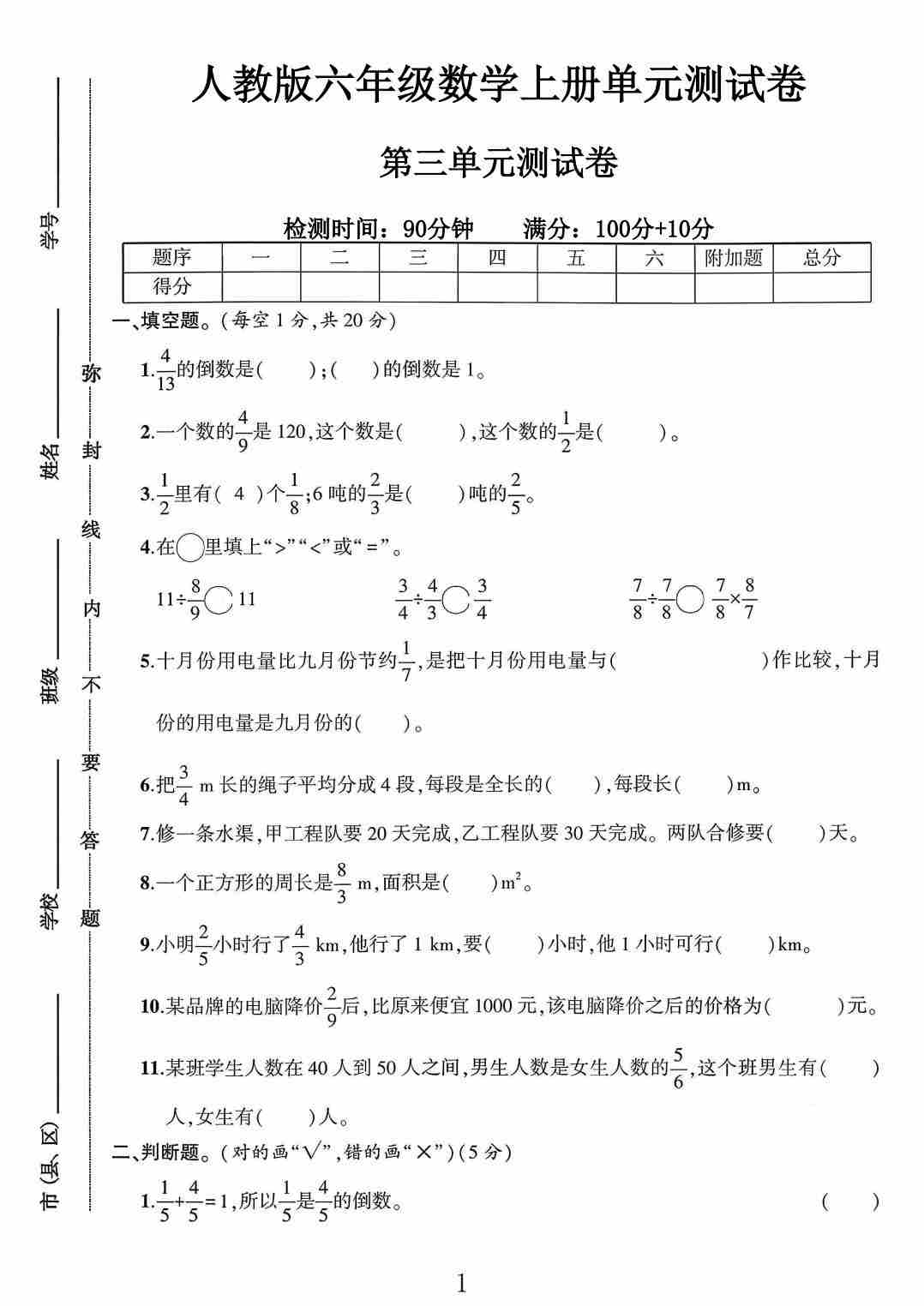 六上人教版数学【期中阶段检测卷(二)(易错篇)(含答案】)