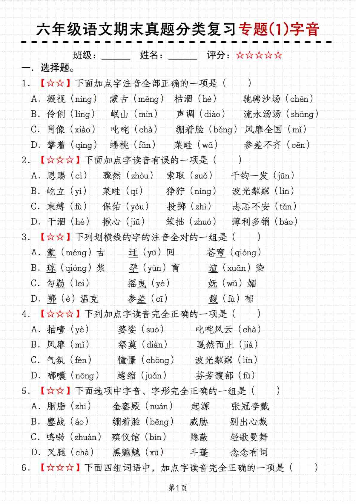 【期末真题分类复习专项(1)字音】六上语文