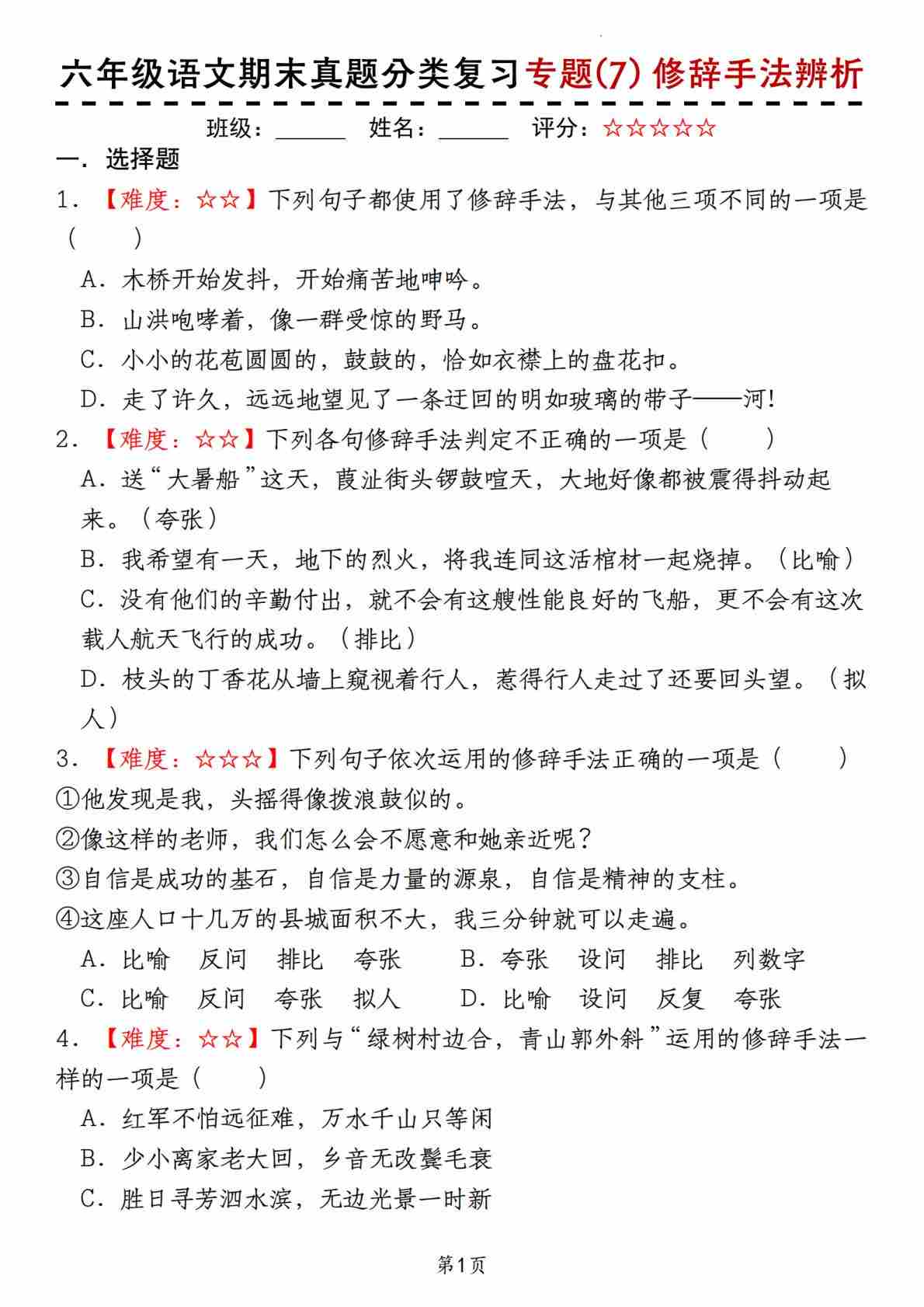 【期末真题分类复习专题(7)修辞手法辨析】六上语文