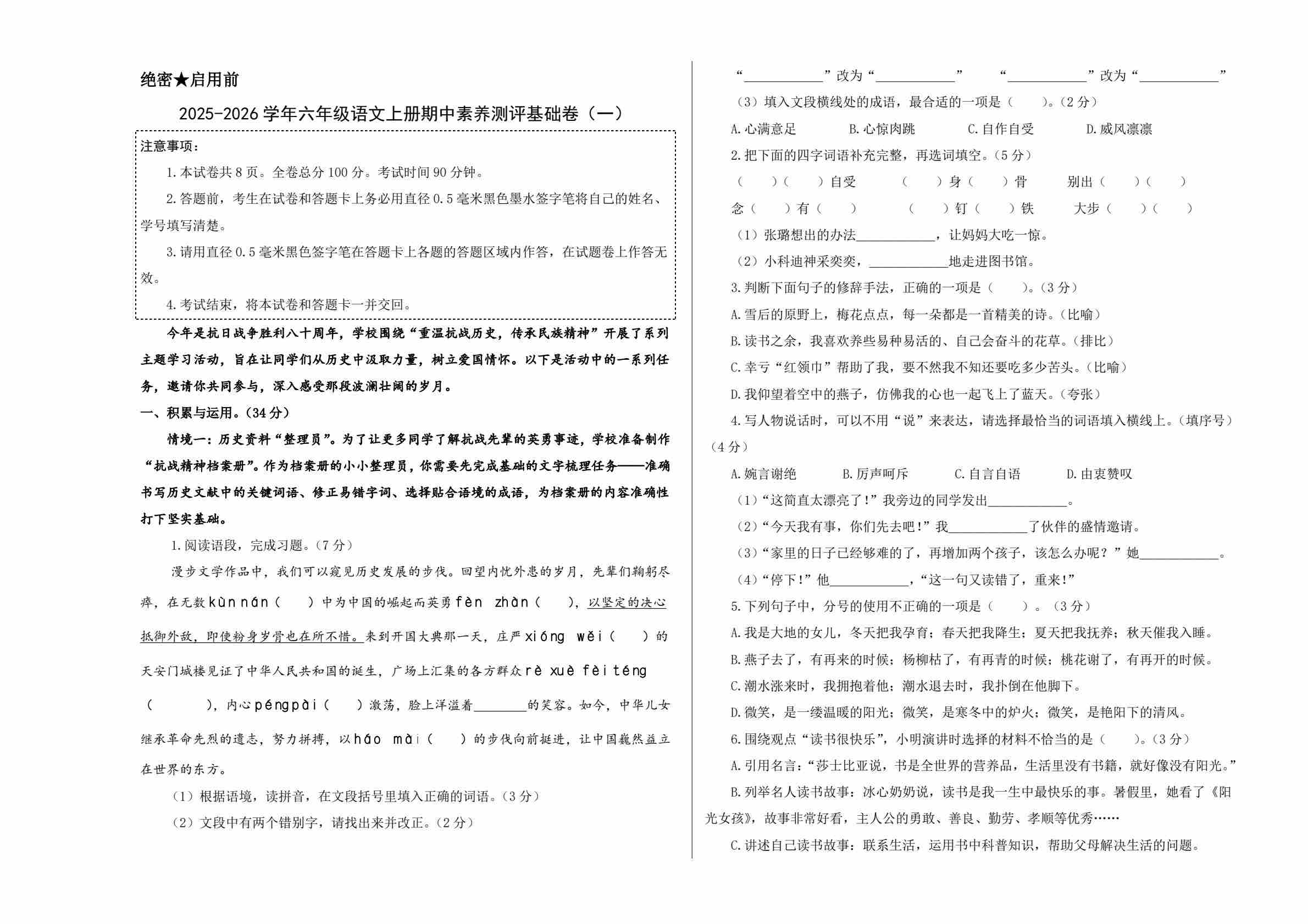 25-26学年六年级(上)语文期中素养测评基础卷(一)