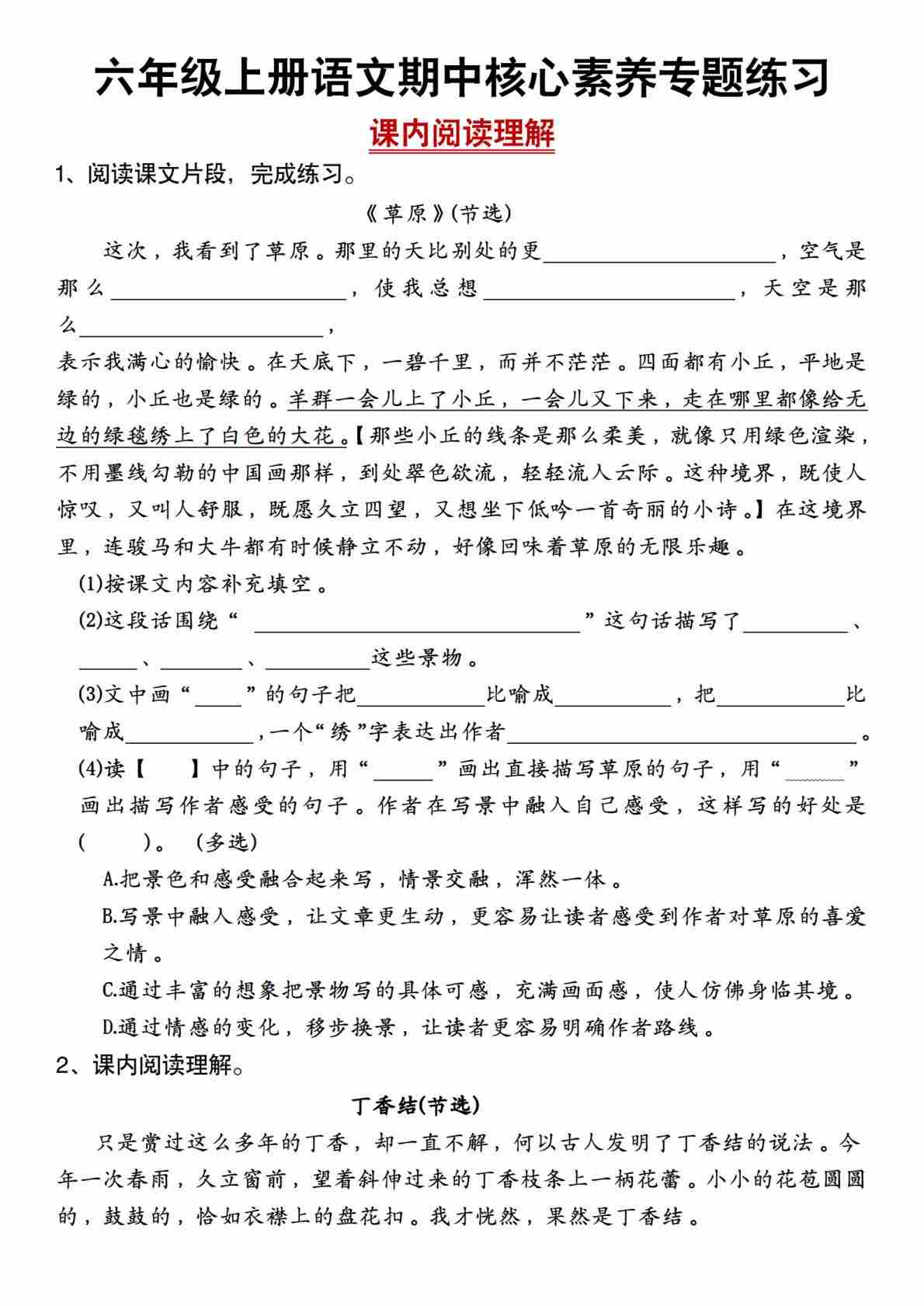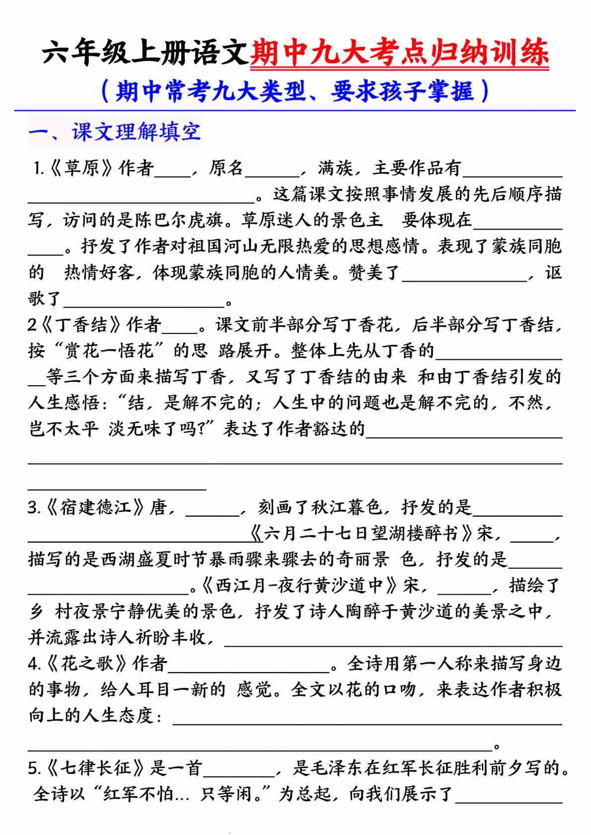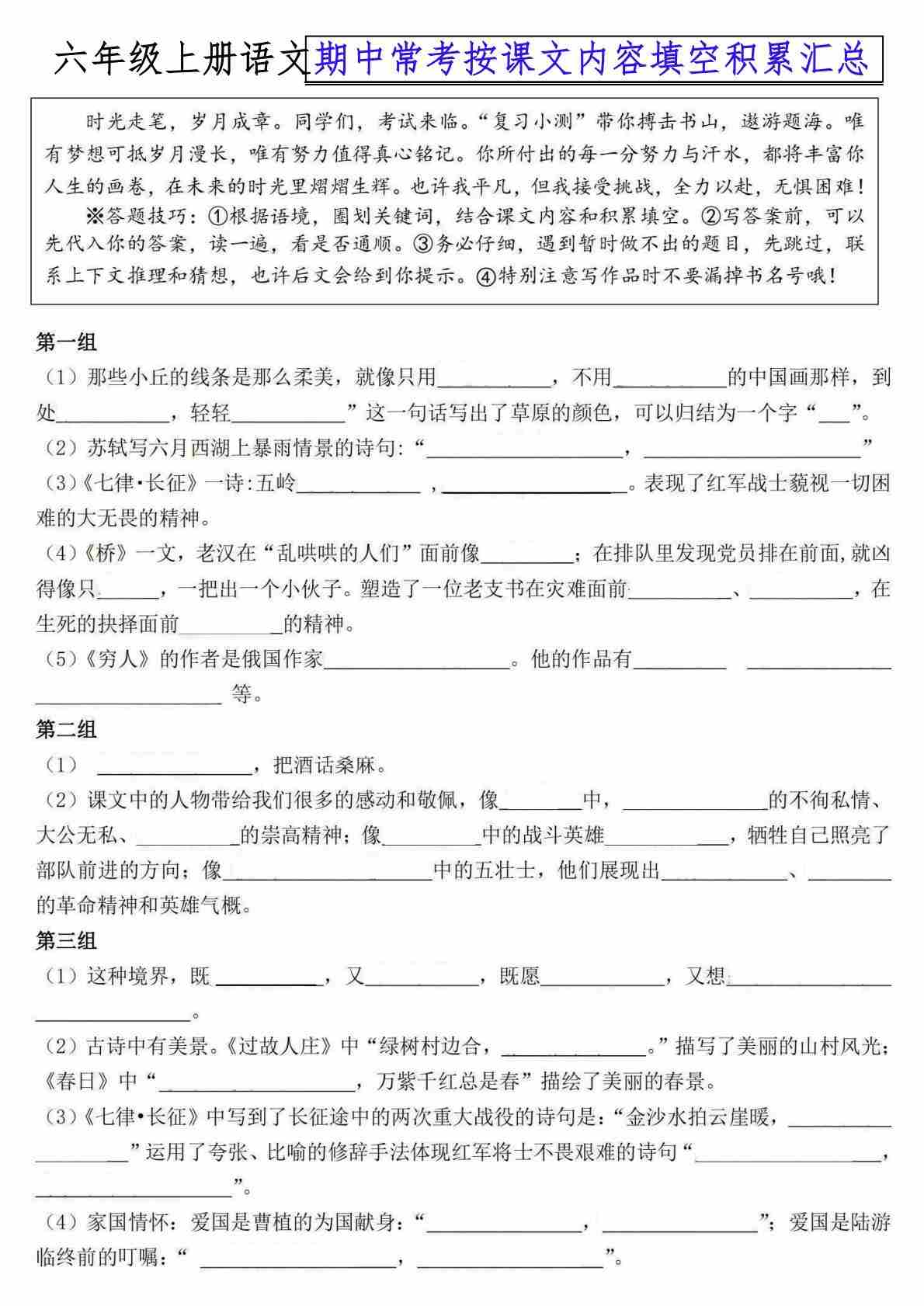 六上语文【期中情境填空·情境默写古诗词日积月累专项(答案版8页)】 (1)