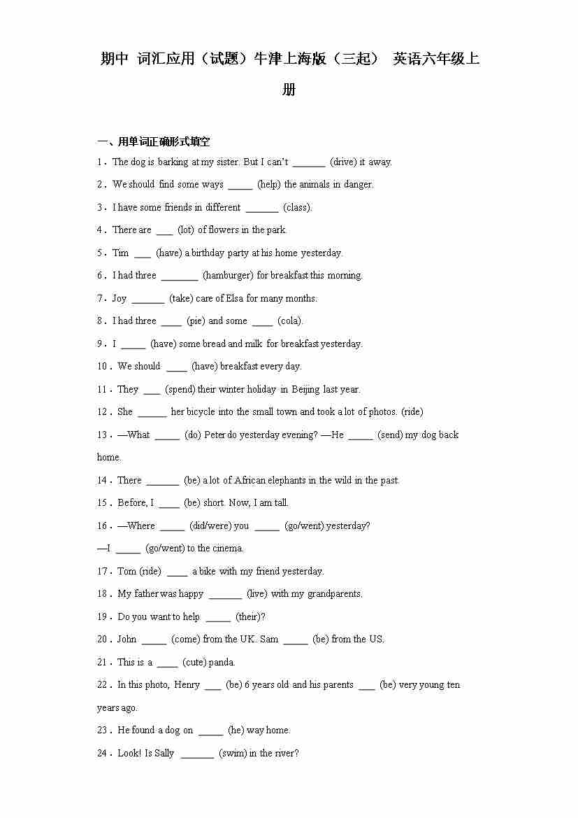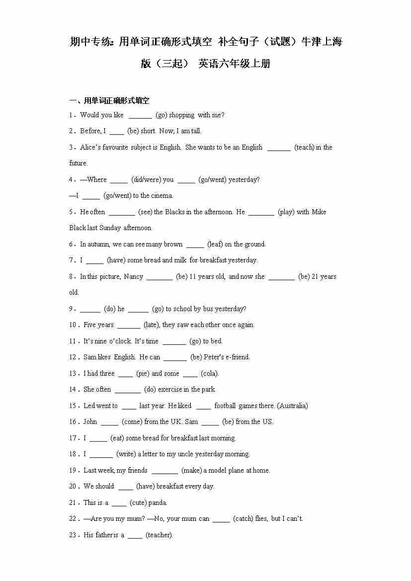 期中专练:用单词正确形式填空与补全句子(试题)牛津上海版(三起)英语六年级上册