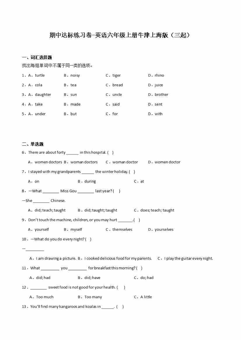 期中达标练习卷-英语六年级上册牛津上海版(三起)