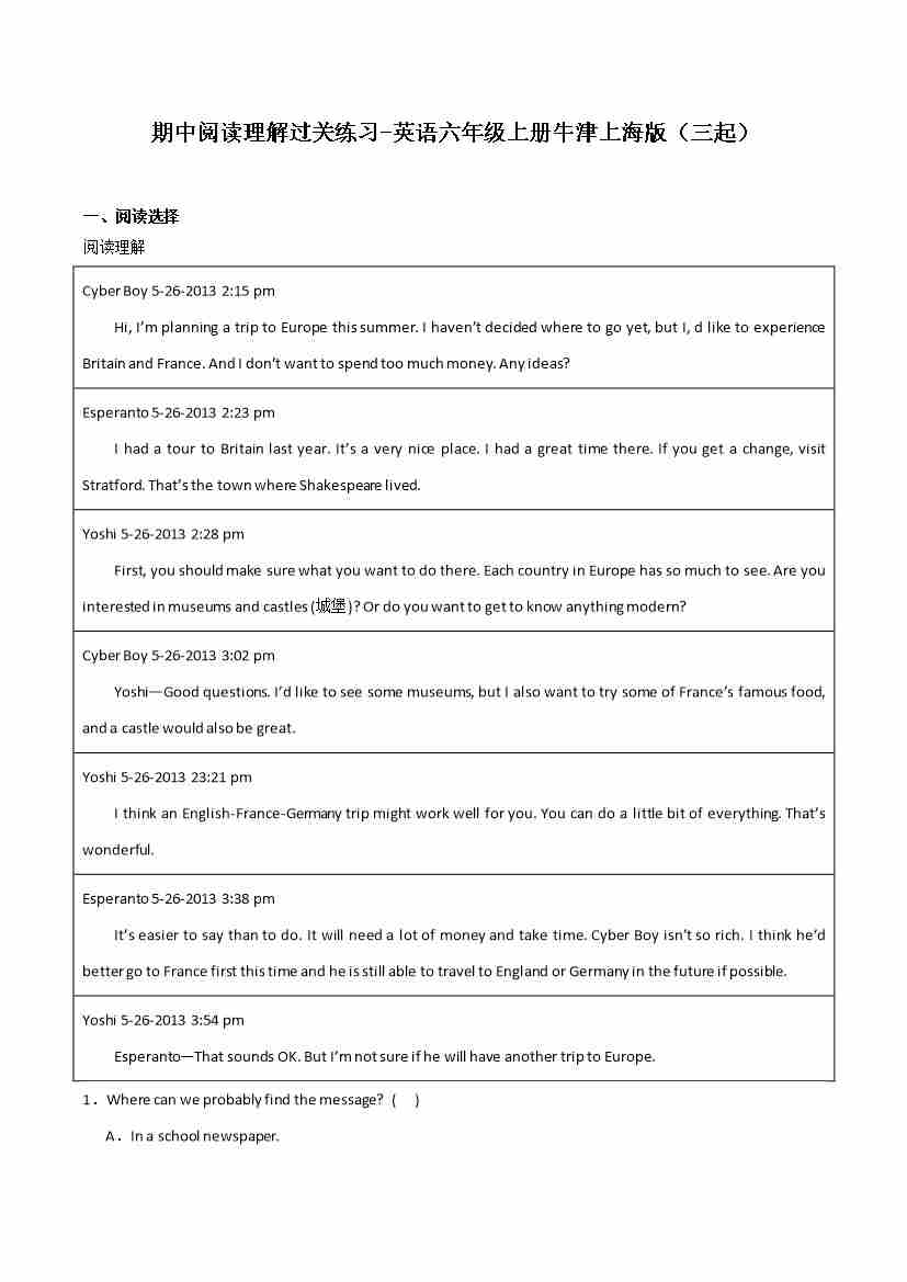 期中阅读理解过关练习-英语六年级上册牛津上海版(三起)