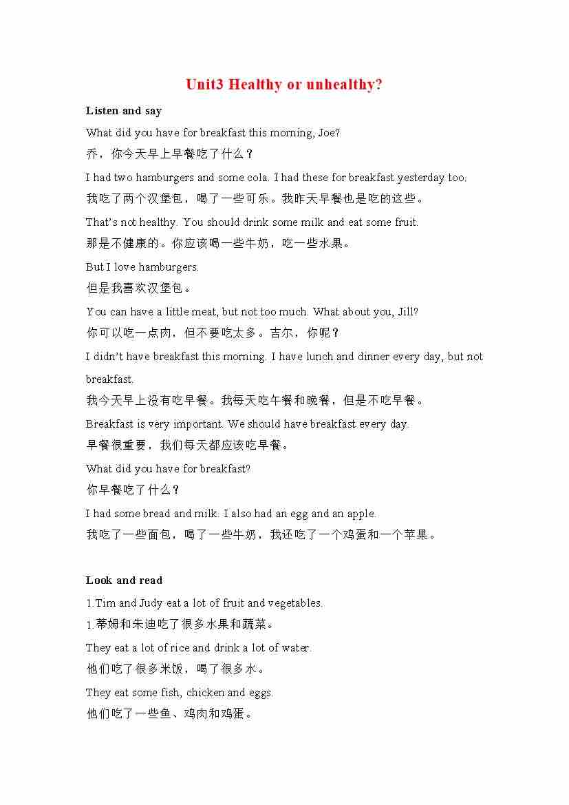 六年级英语上册素材-Unit3 Healthy or unhealthy课文翻译 沪教牛津版(深圳用)